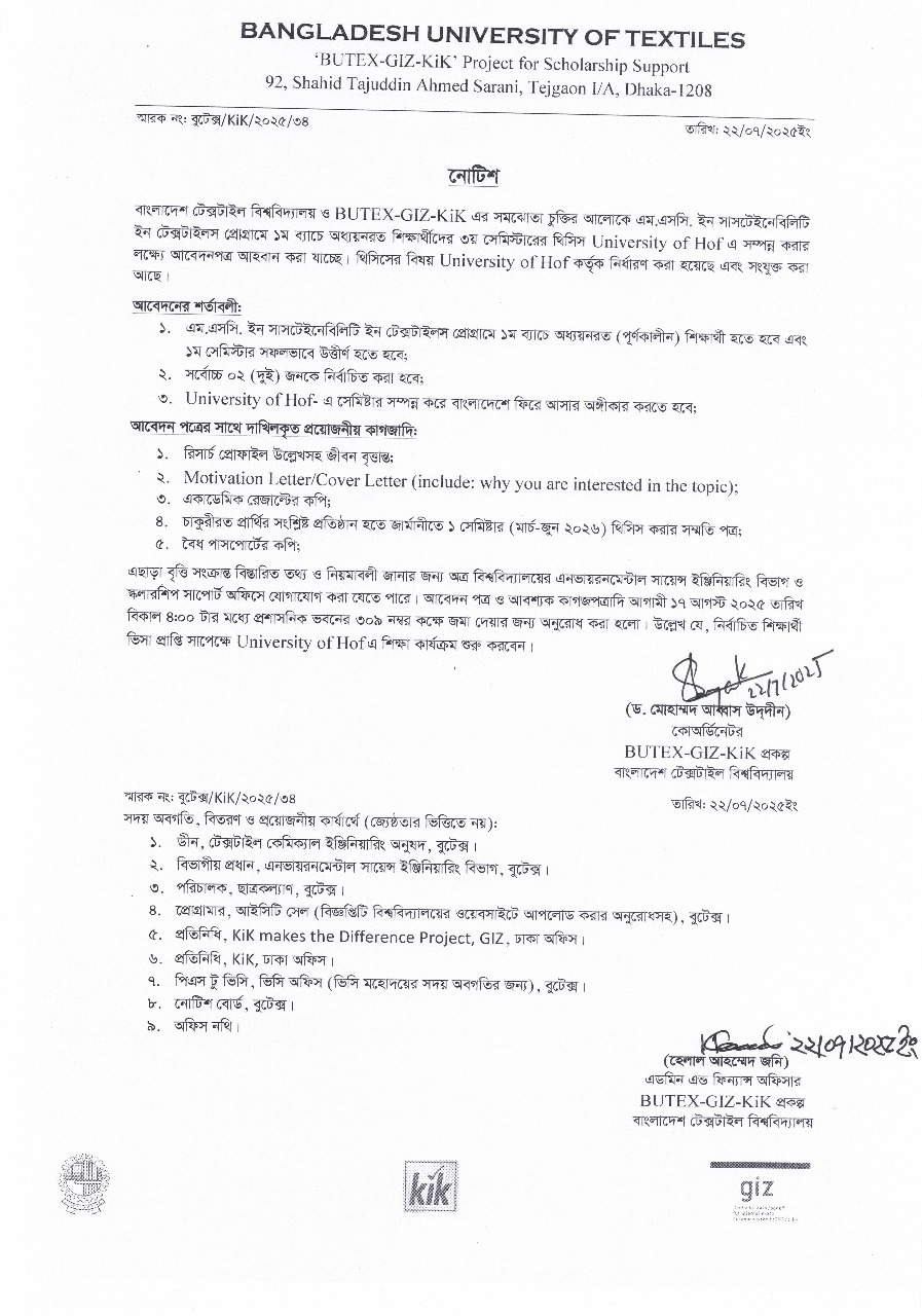 3rd Call Notice for Selected & Waiting Candidates of BSc in Textile Engineering Admission Test 2025-26