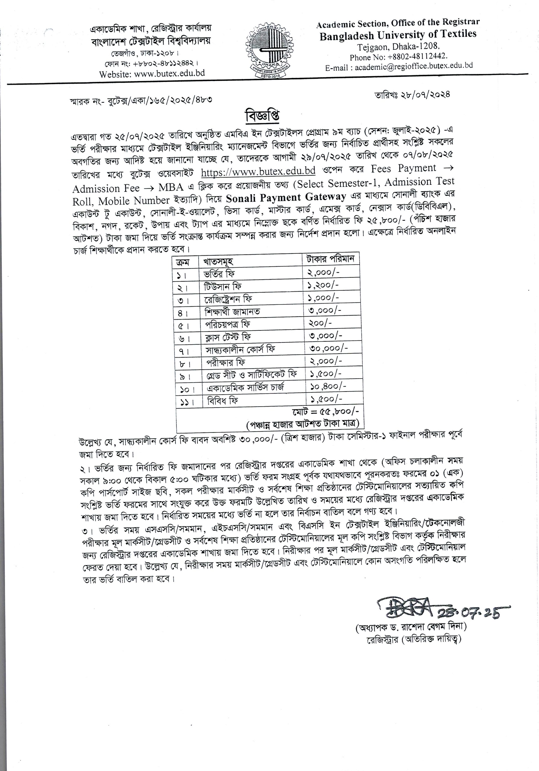 Fees Payment Notice of MBA in Textiles Program 9th Batch