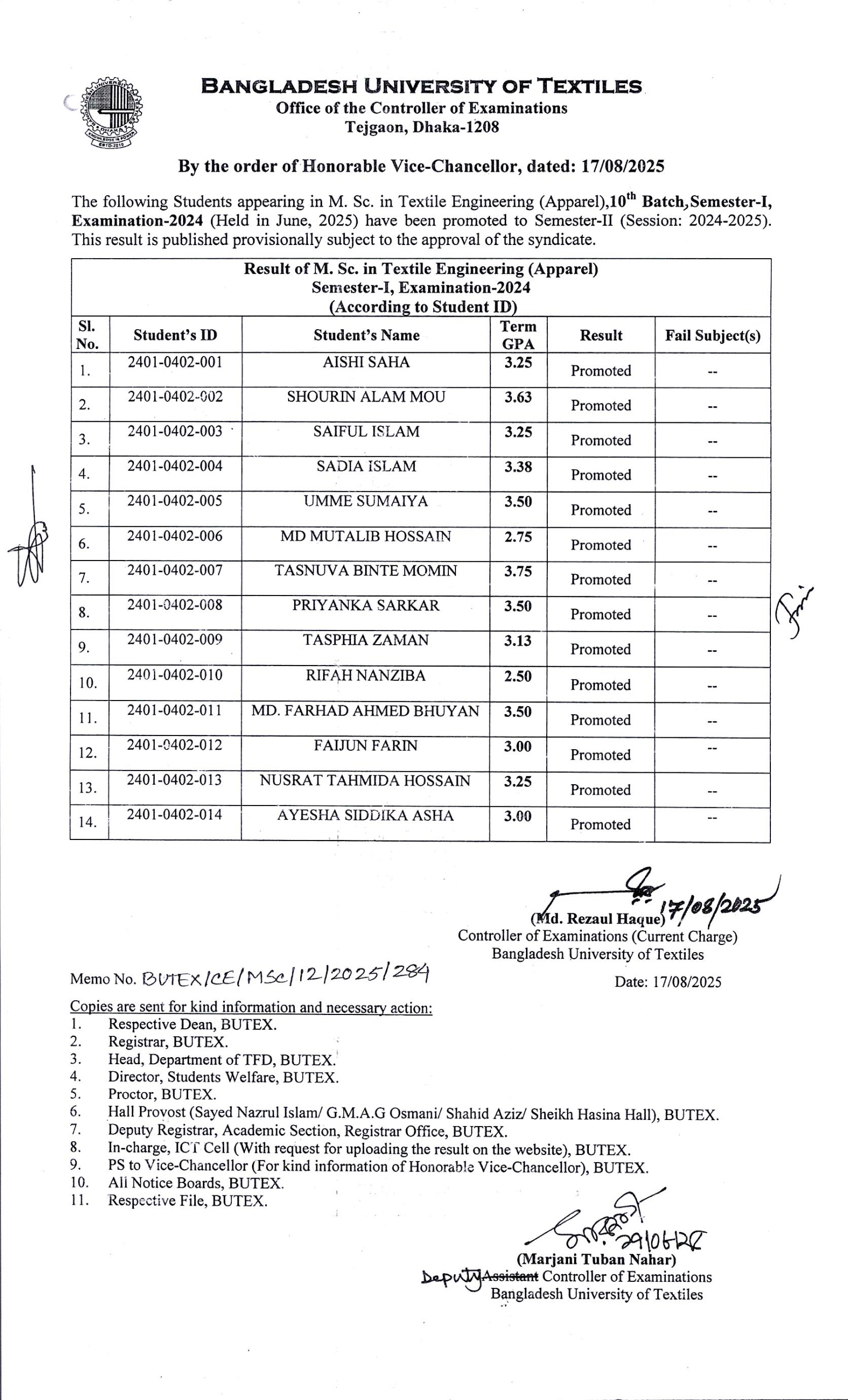 Result of MSc in Textile Engineering (Apparel) 10th Batch Semester-I