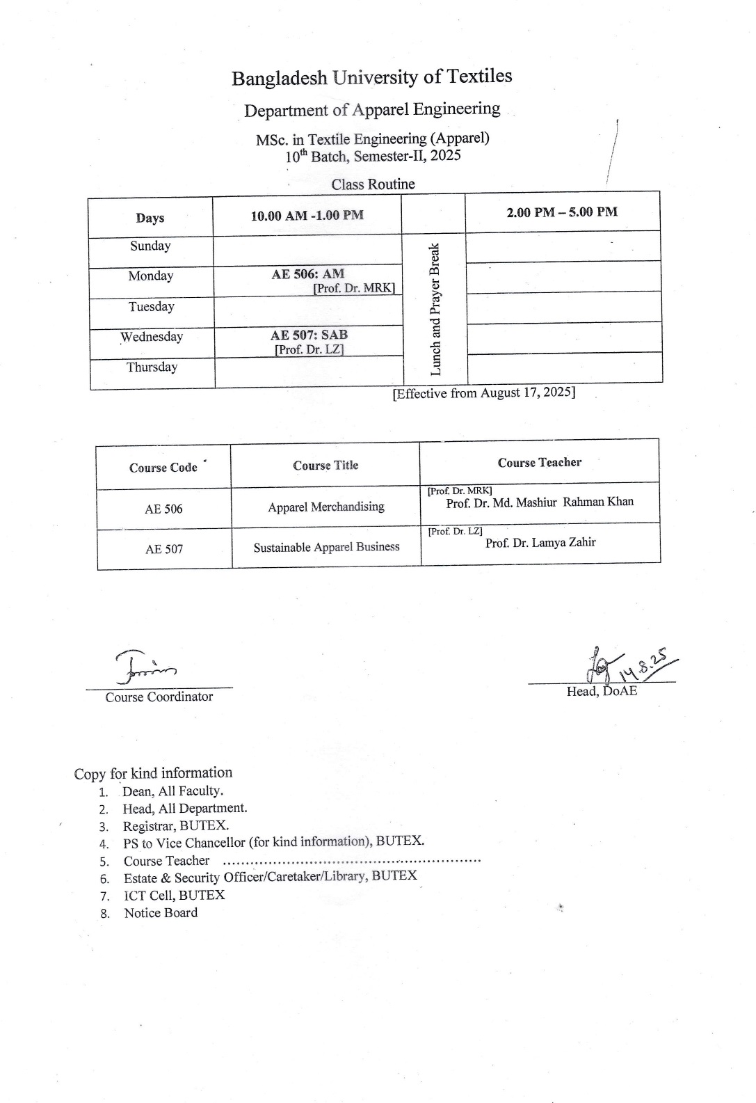 Class Schedule of MSc in Textile Engineering (Apparel) 10th Batch Semester-II