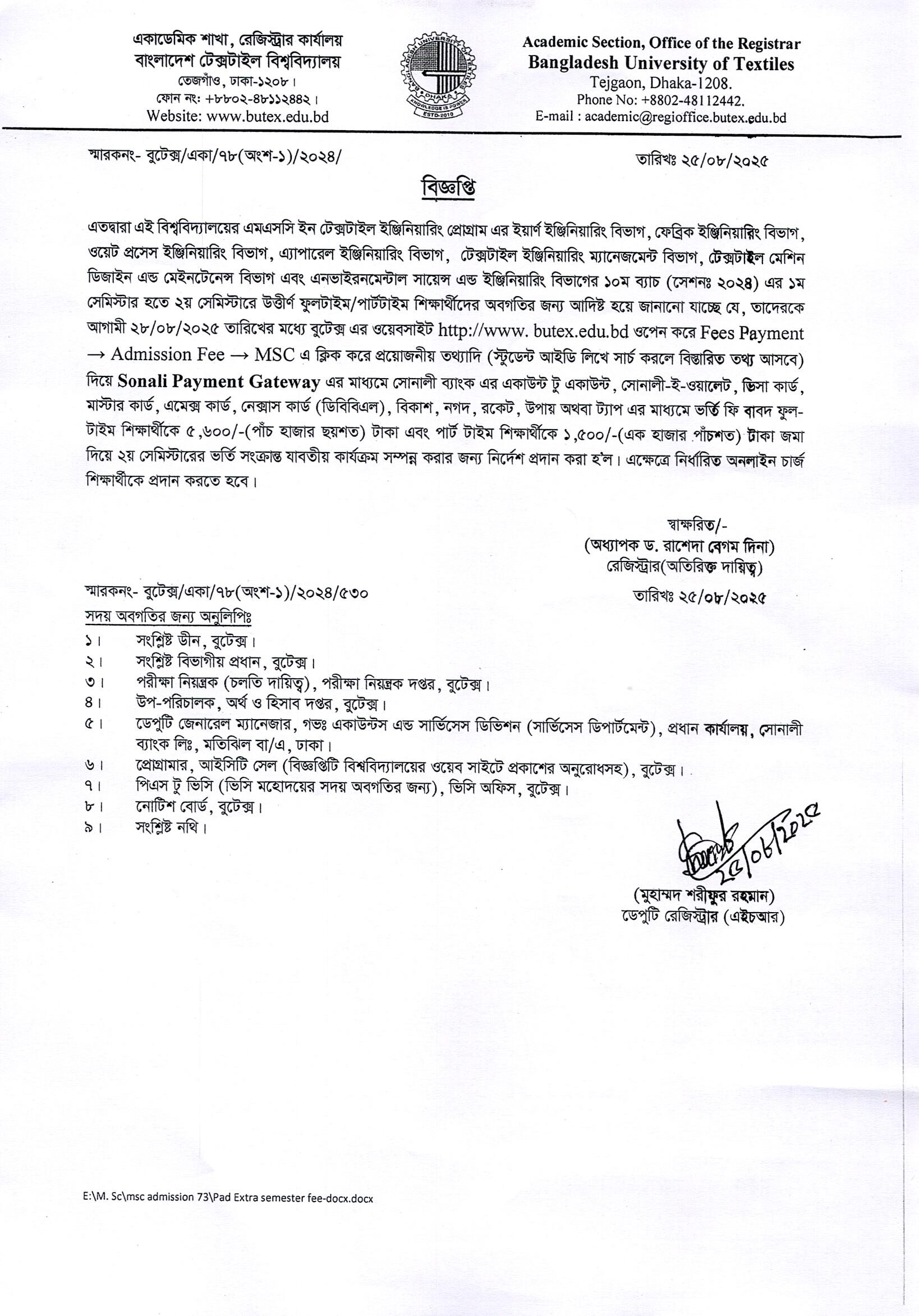 Admission Notice: MSc in Textile Engineering 10th Batch Semester-II