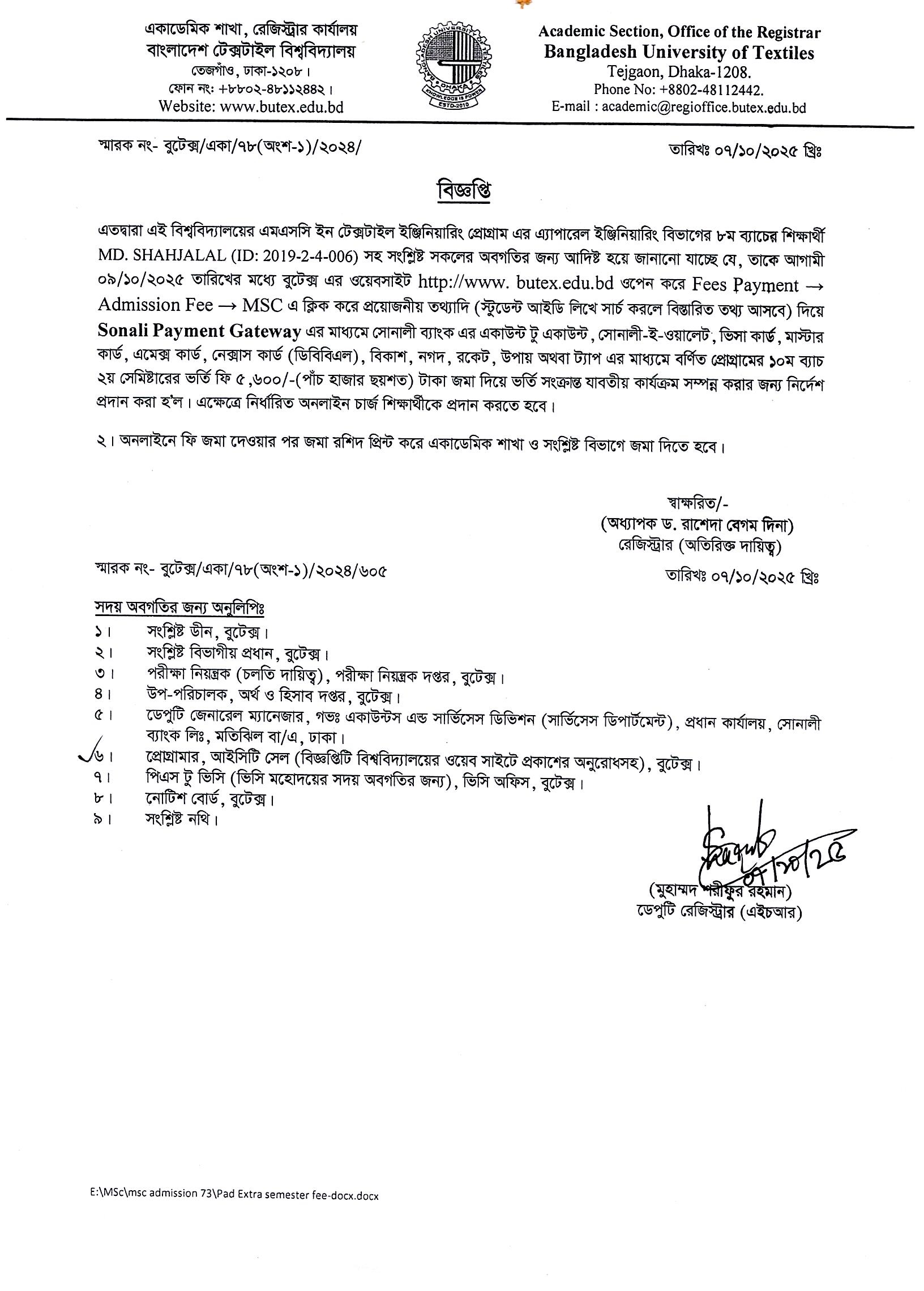 Fees Payment Notice of MSc in Textile Engineering