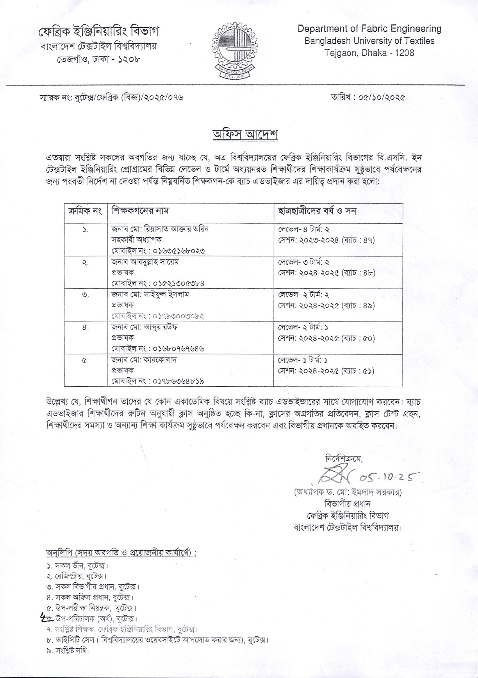 Batch Adviser Notice of Fabric Department