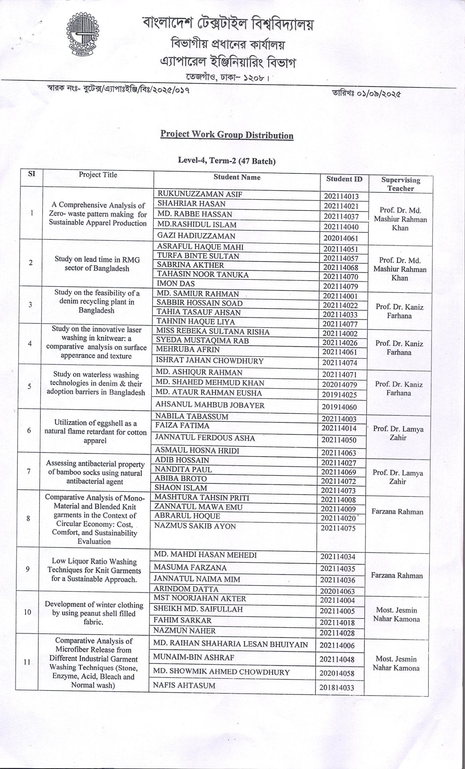 Apparel Dept. Project Work Group Distribution of BSc in Textile Engineering L-4 T-2