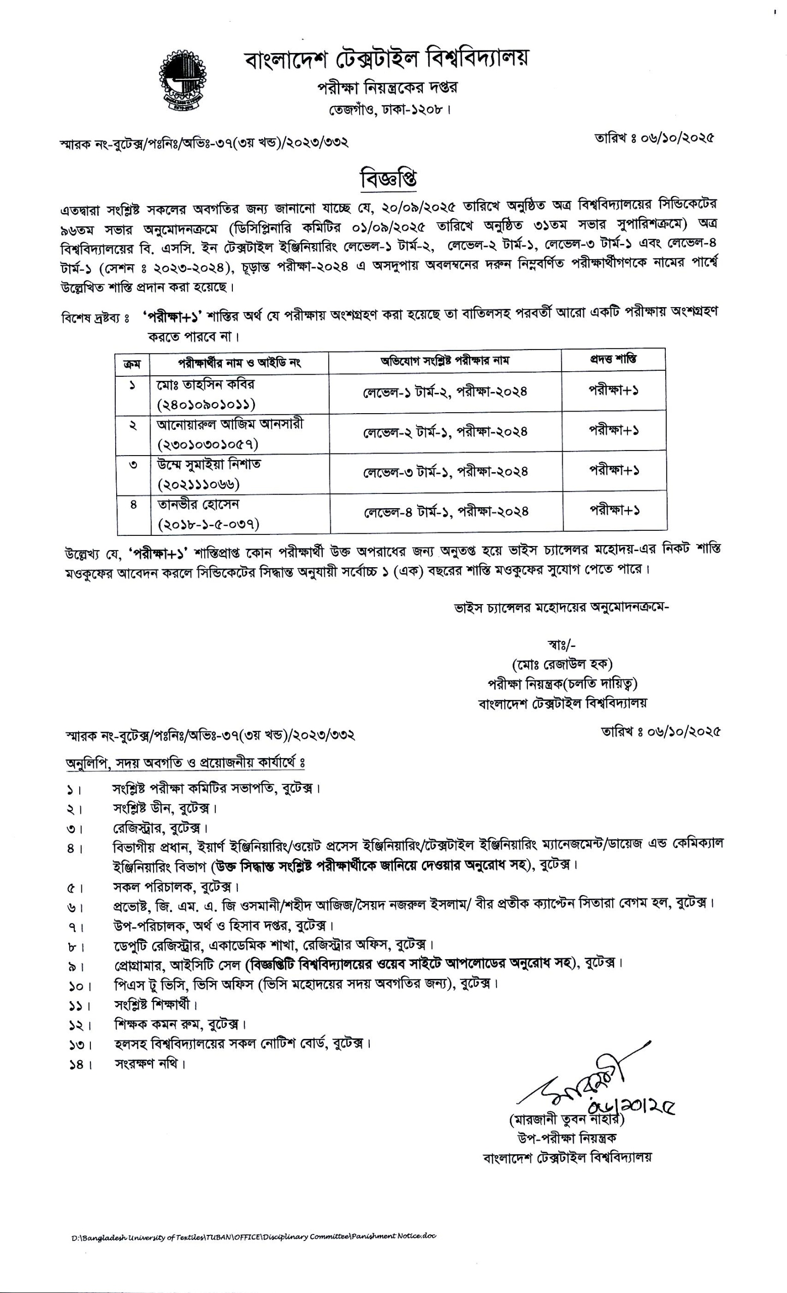 3rd Call Notice for Selected & Waiting Candidates of BSc in Textile Engineering Admission Test 2025-26