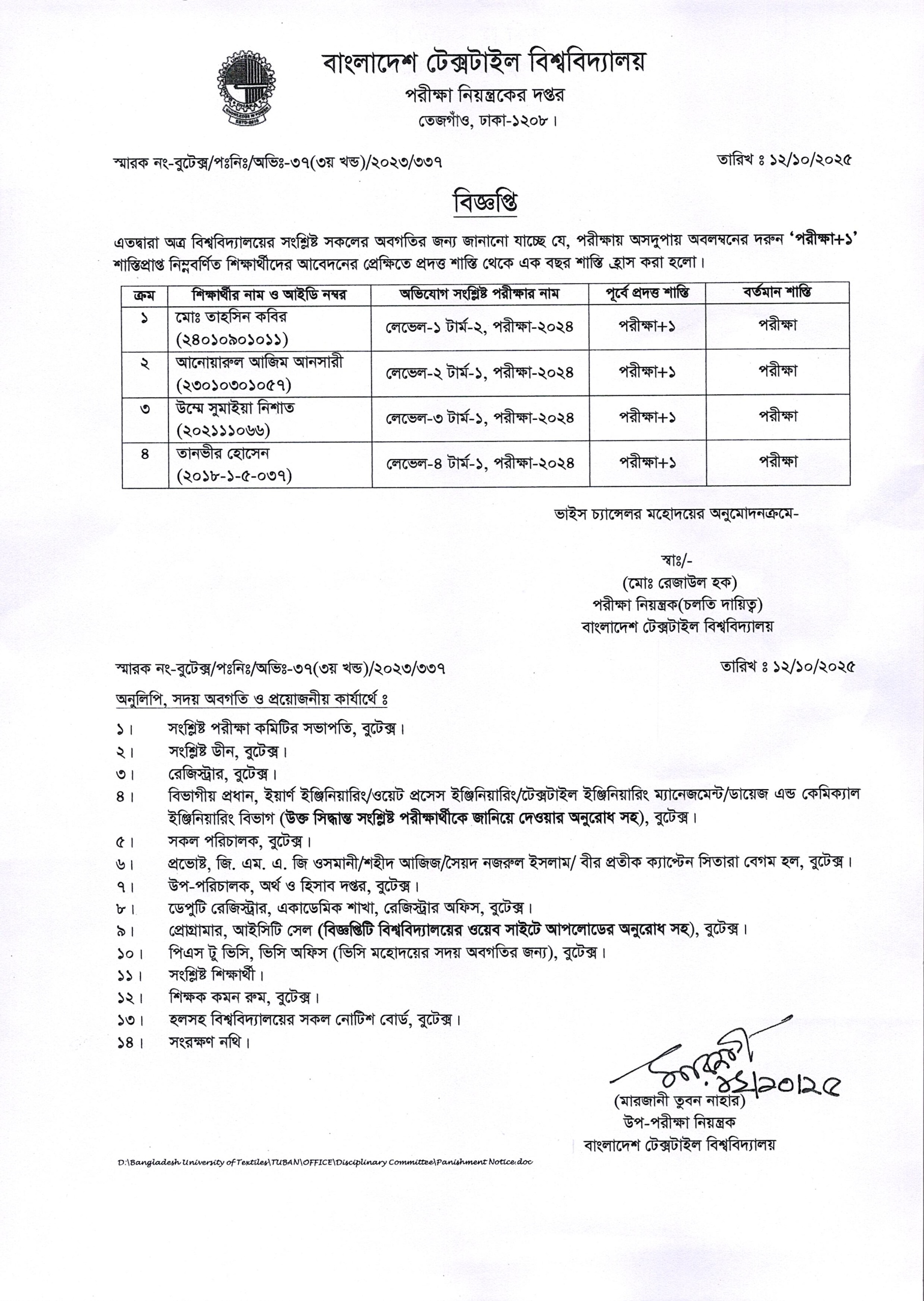 Admission Cancellation Notice: BSc in Textile Engineering 51th Batch
