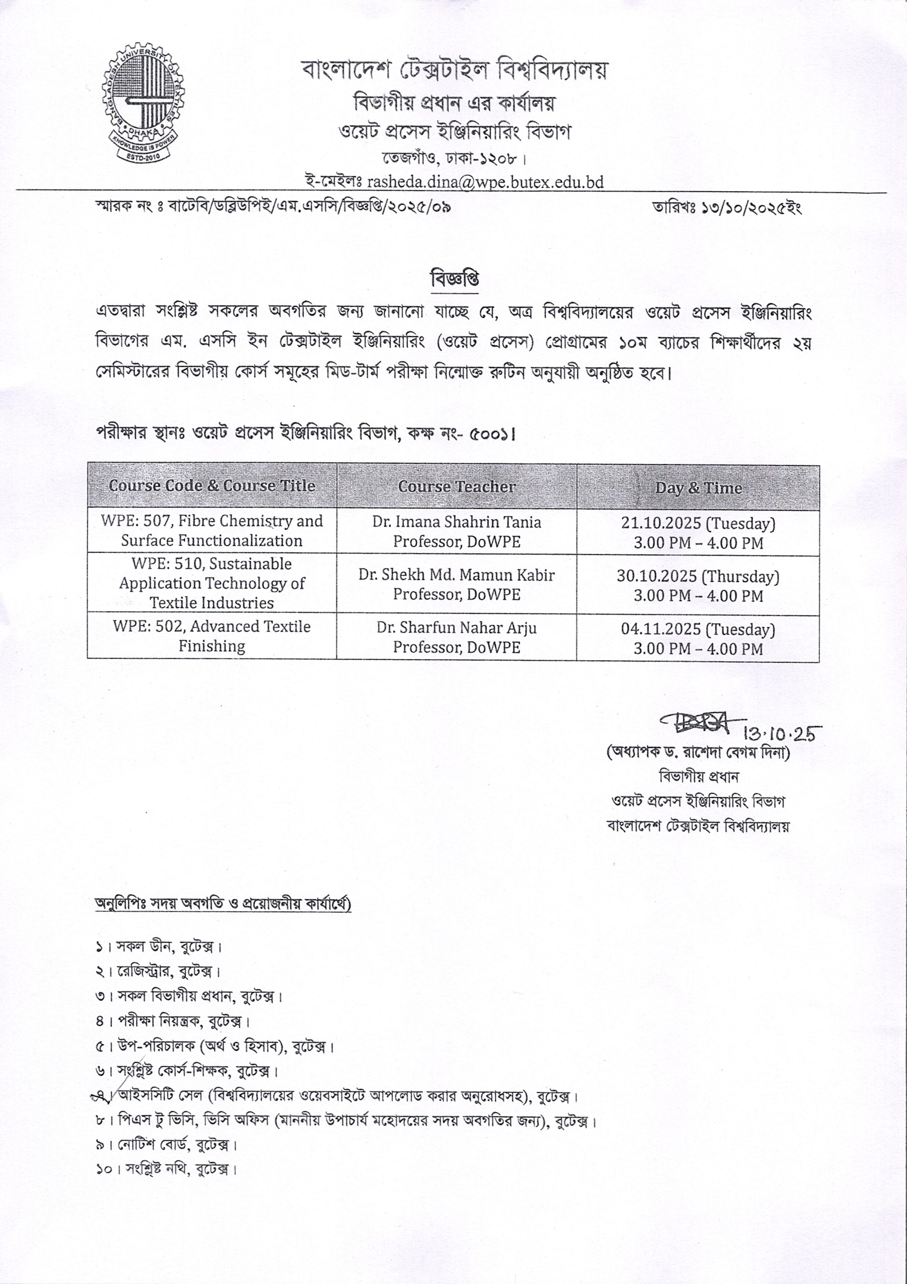 Mid Term Exam Routine of MSc in Textile Eng. (Wet Process) 10th Batch 2nd Semester