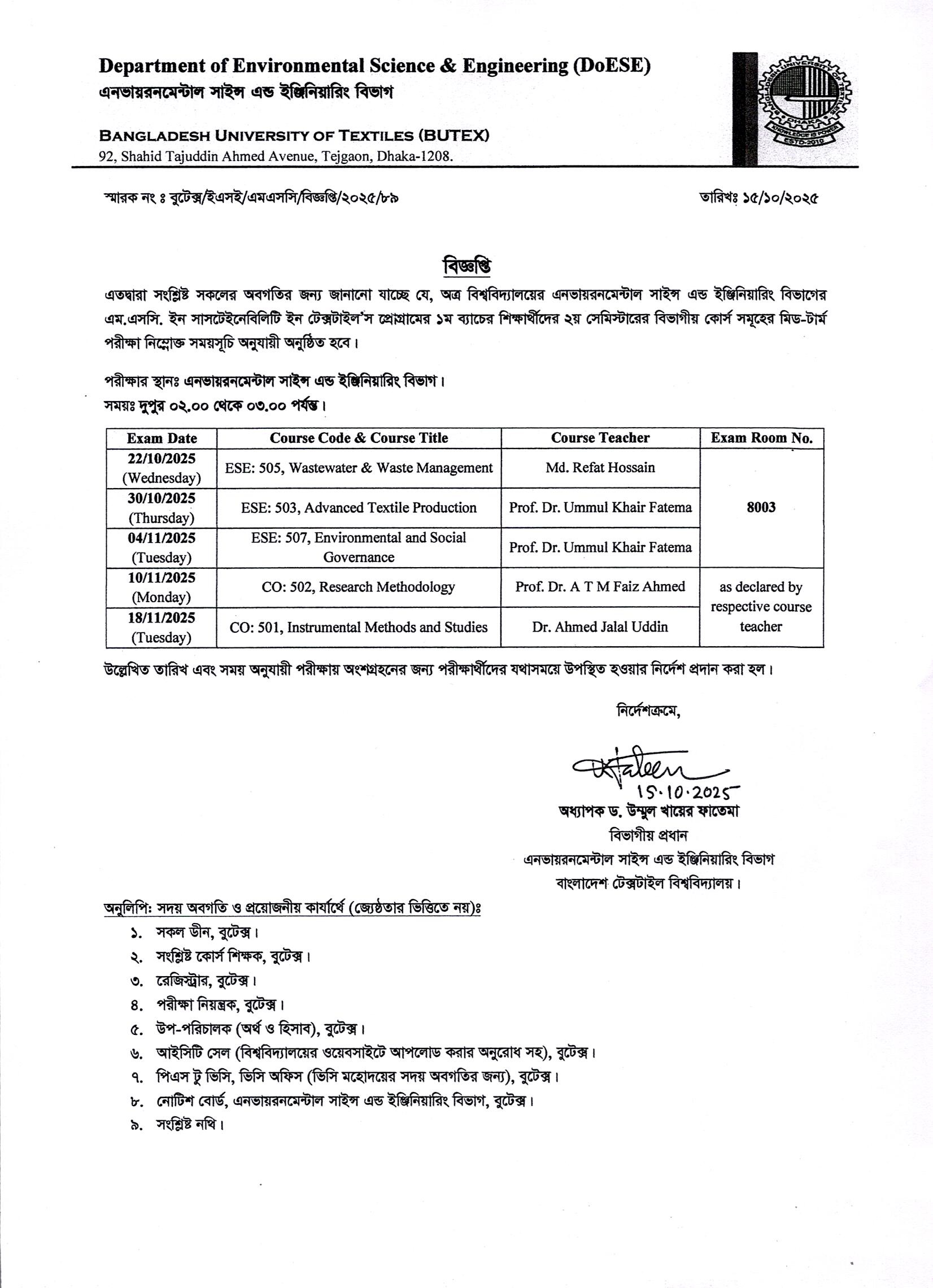 Mid Term Exam Routine of MSc in Textile Eng. (ESE) 1st Batch 2nd Semester