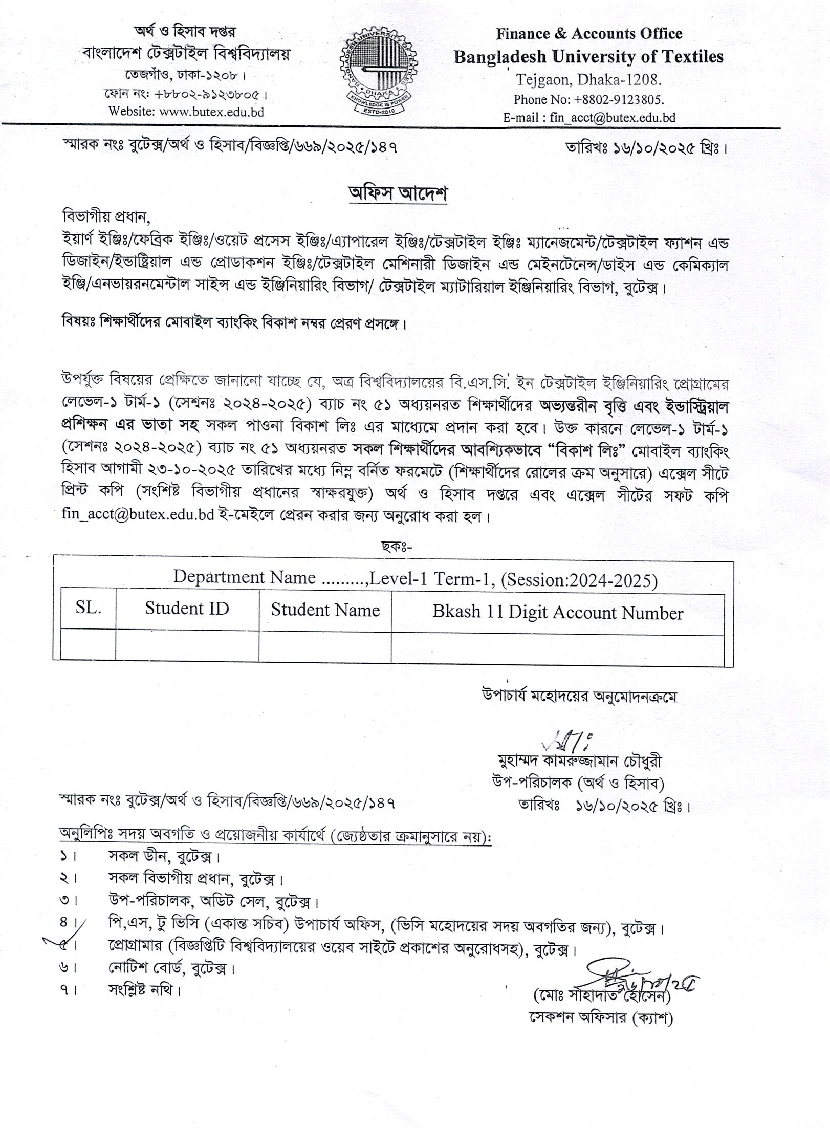 Notice: 51 Batch of BSc in Textile Engineering Student’s Mobile Banking Bkash No.