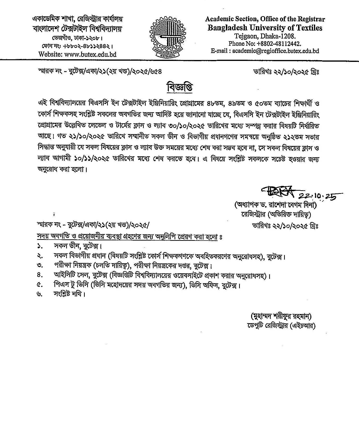 Academic Notice of 48, 49 & 50 Batch Students BSc in Textile Engineering Program