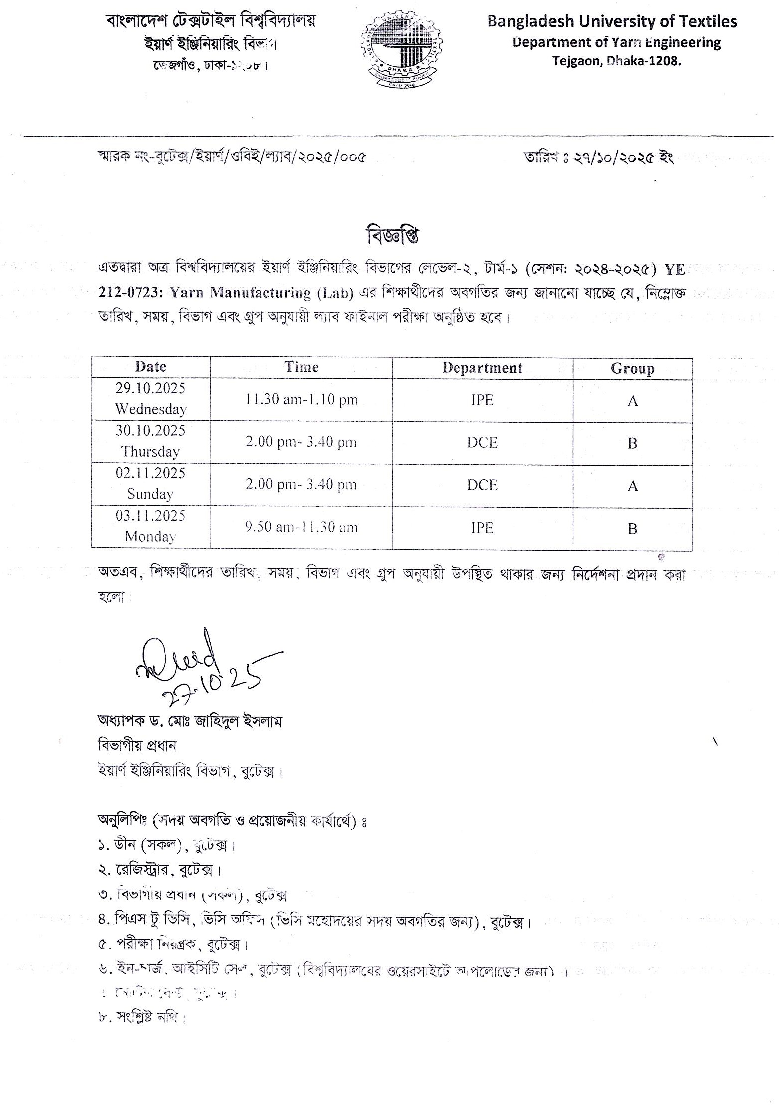 3rd Call Notice for Selected & Waiting Candidates of BSc in Textile Engineering Admission Test 2025-26