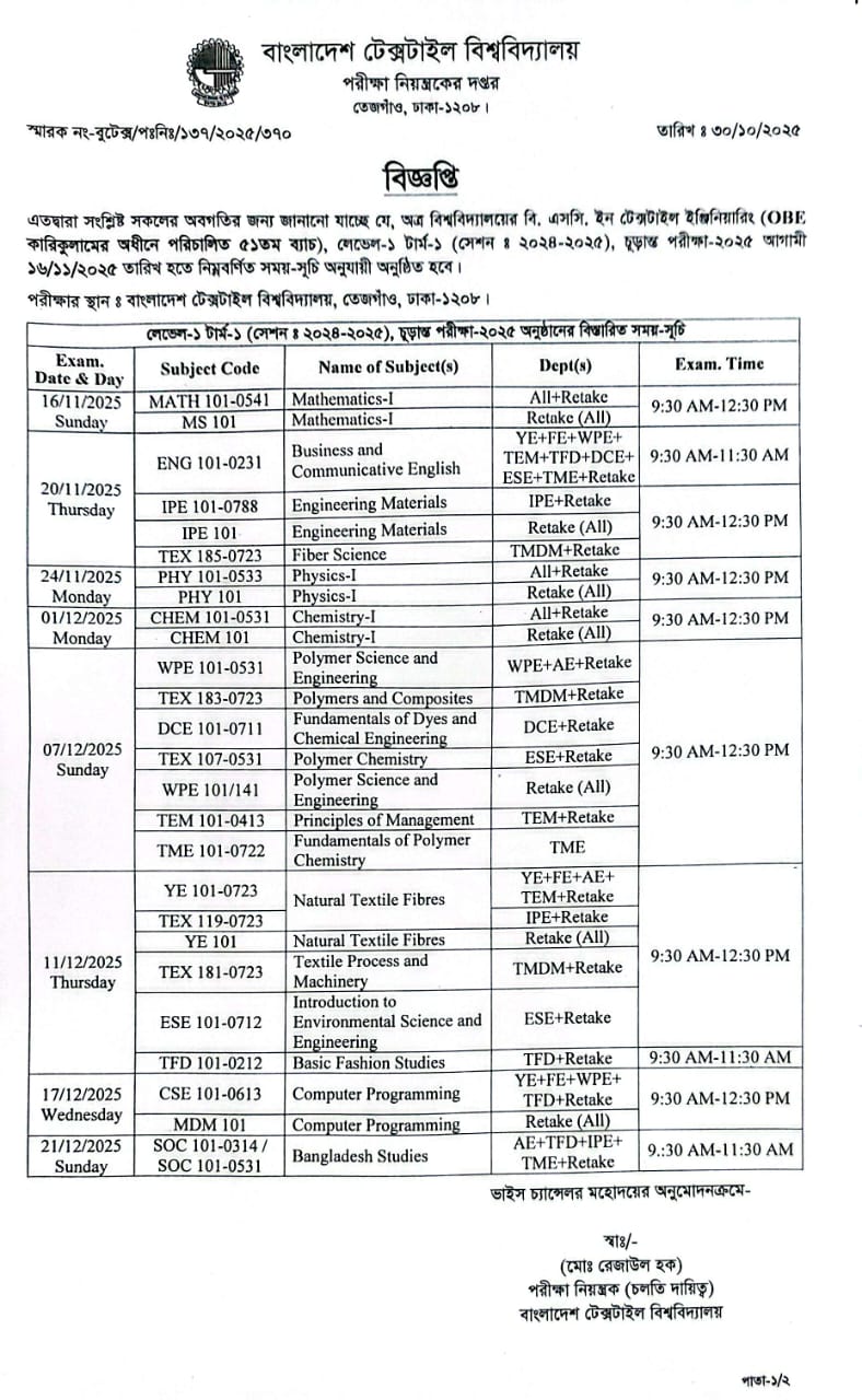 Schedule of BSc in Textile Engineering L1-T1 Exam-2025