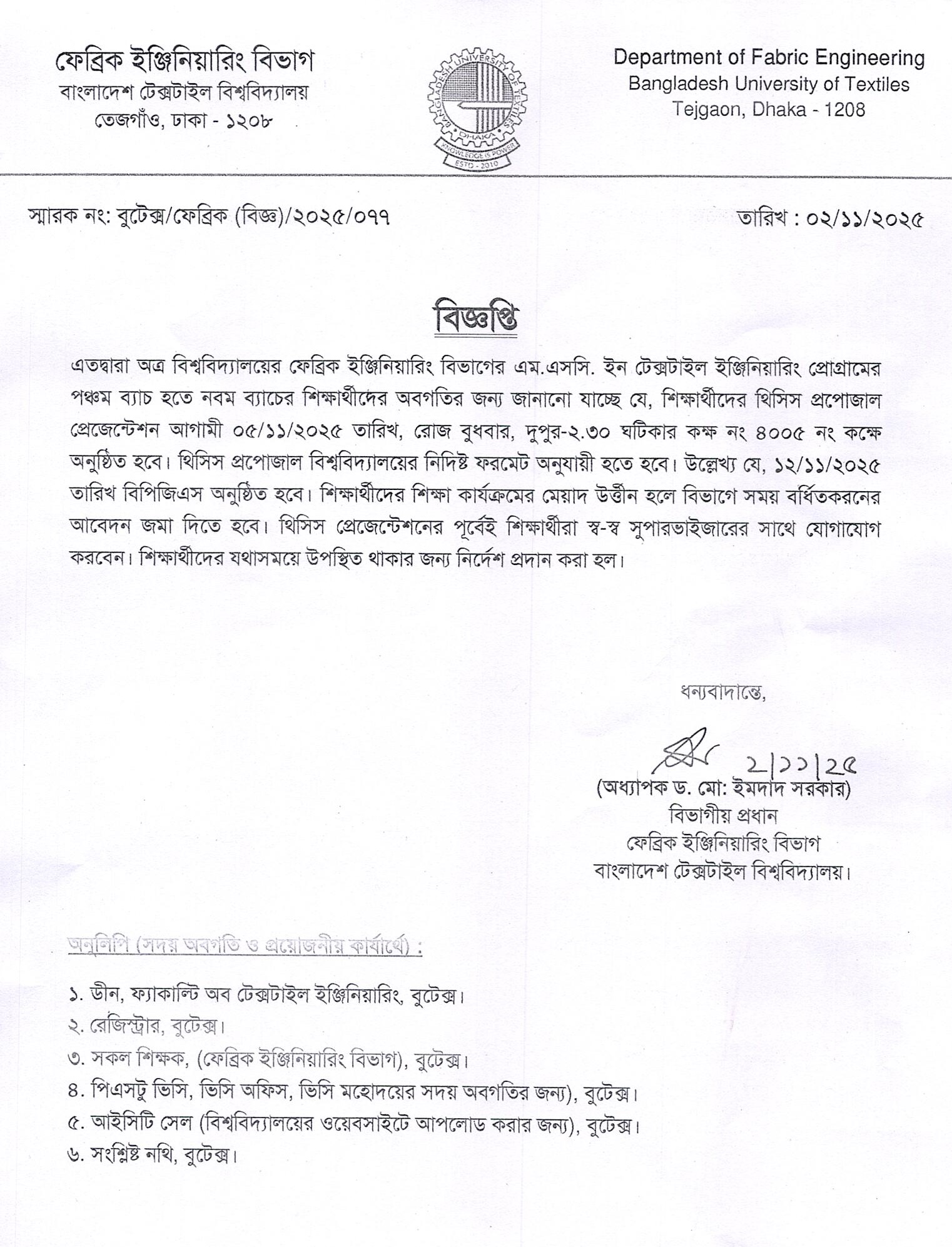 Thesis Proposal Presentation: MSc in Textile Engineering (Fabric Dept.)