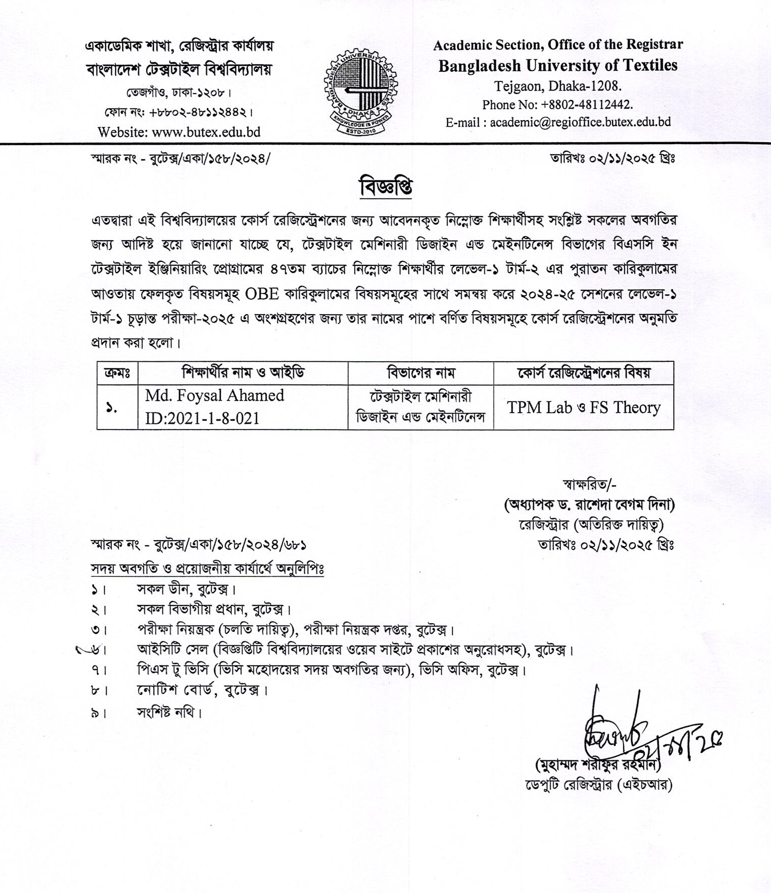 Course Registration Notice: BSc in Textile Engineering (TMDM)
