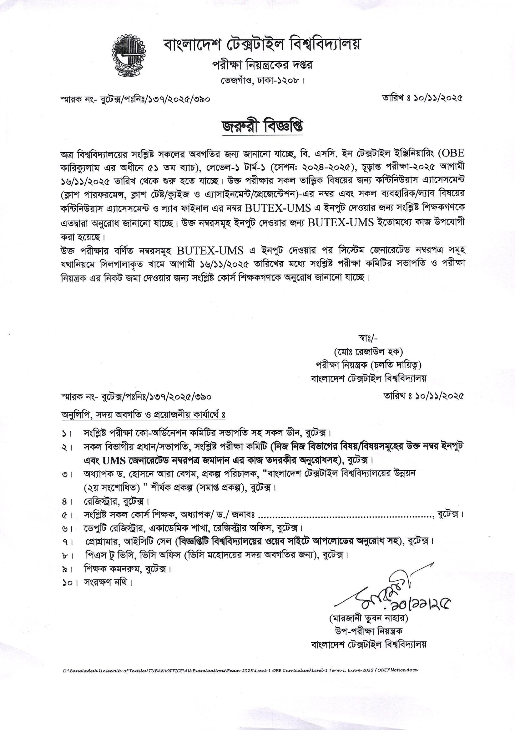 Continuous Assessment & Lab Final Number Submission of BSc in Textile Eng. L1-T1 Session 2024-25