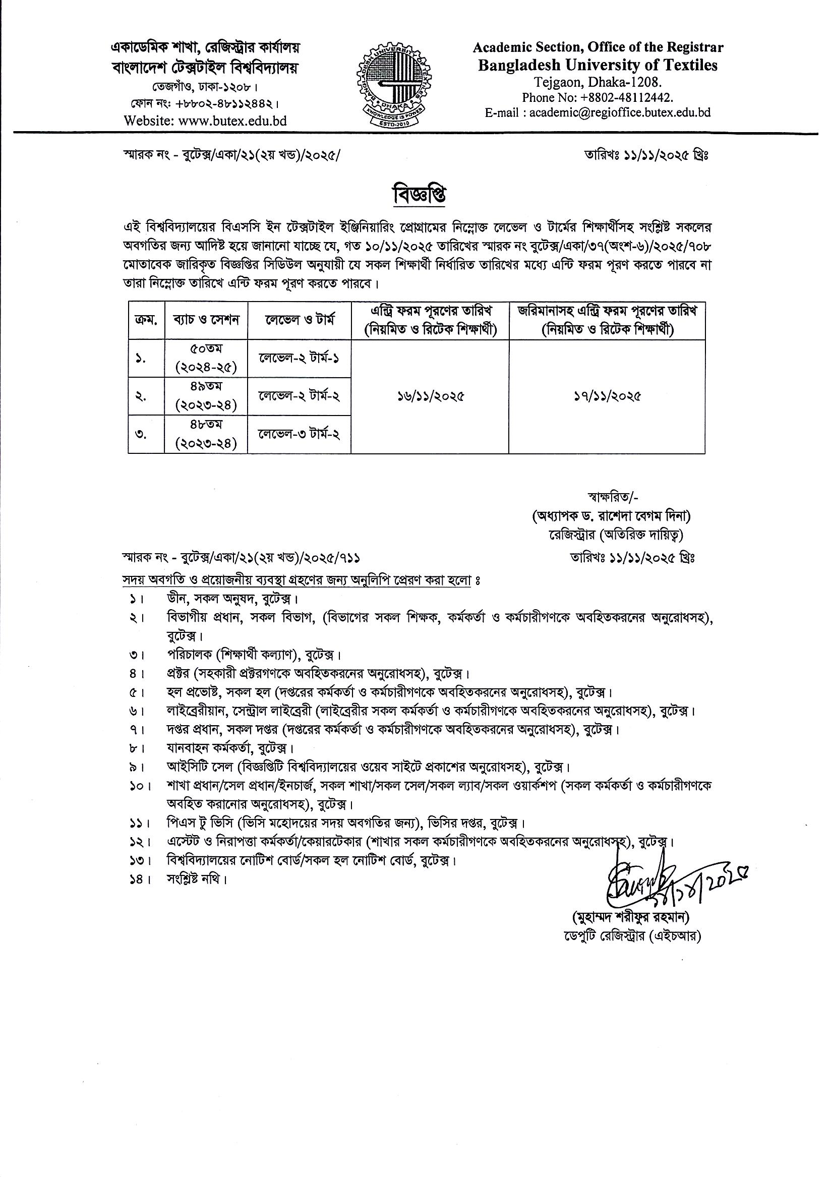 Entry Form Notice of BSc in Textile Engineering L2-T1 L2-T2 L3-T2