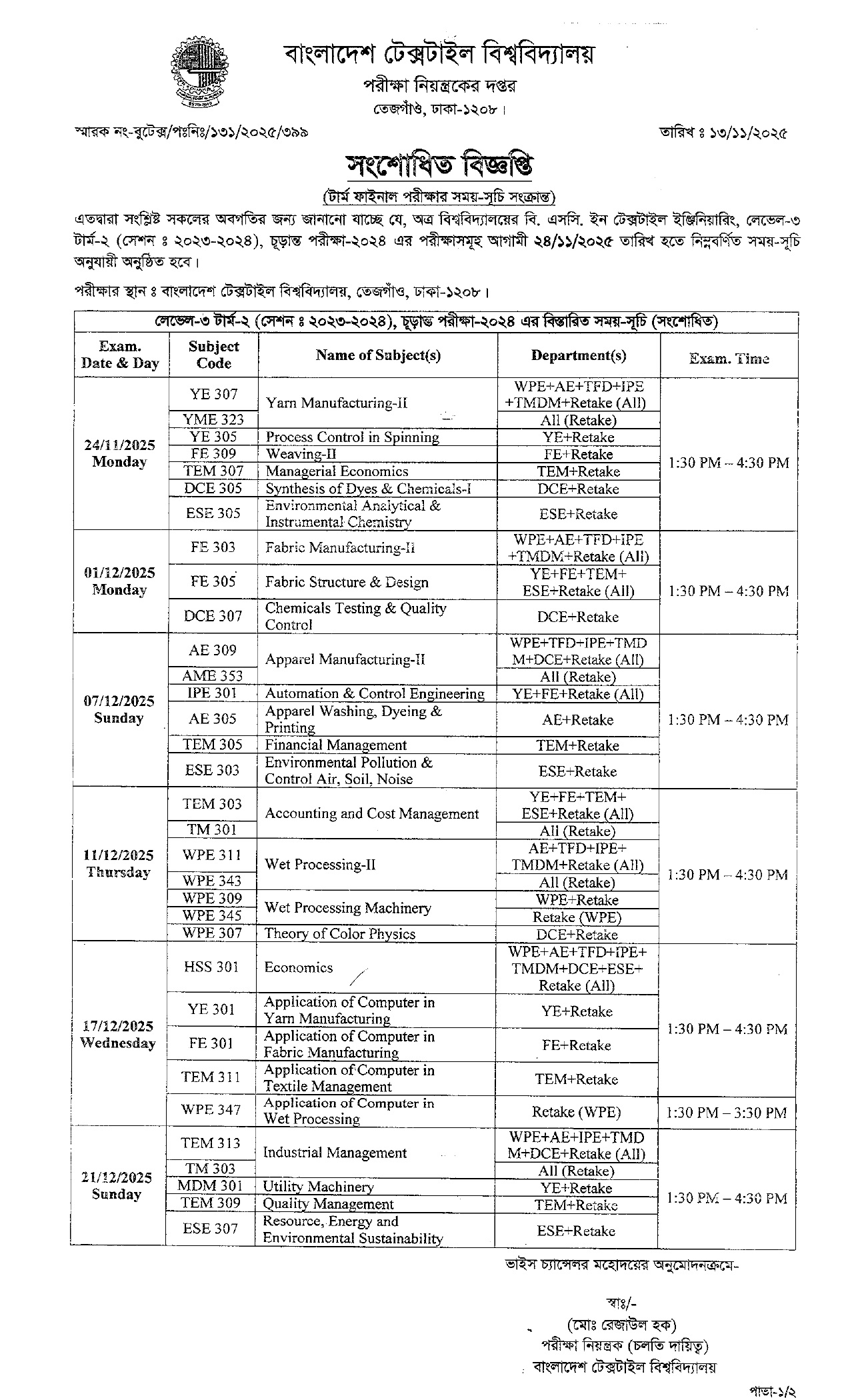 Revised Exam Schedule: BSc in Textile Engineering L3-T2
