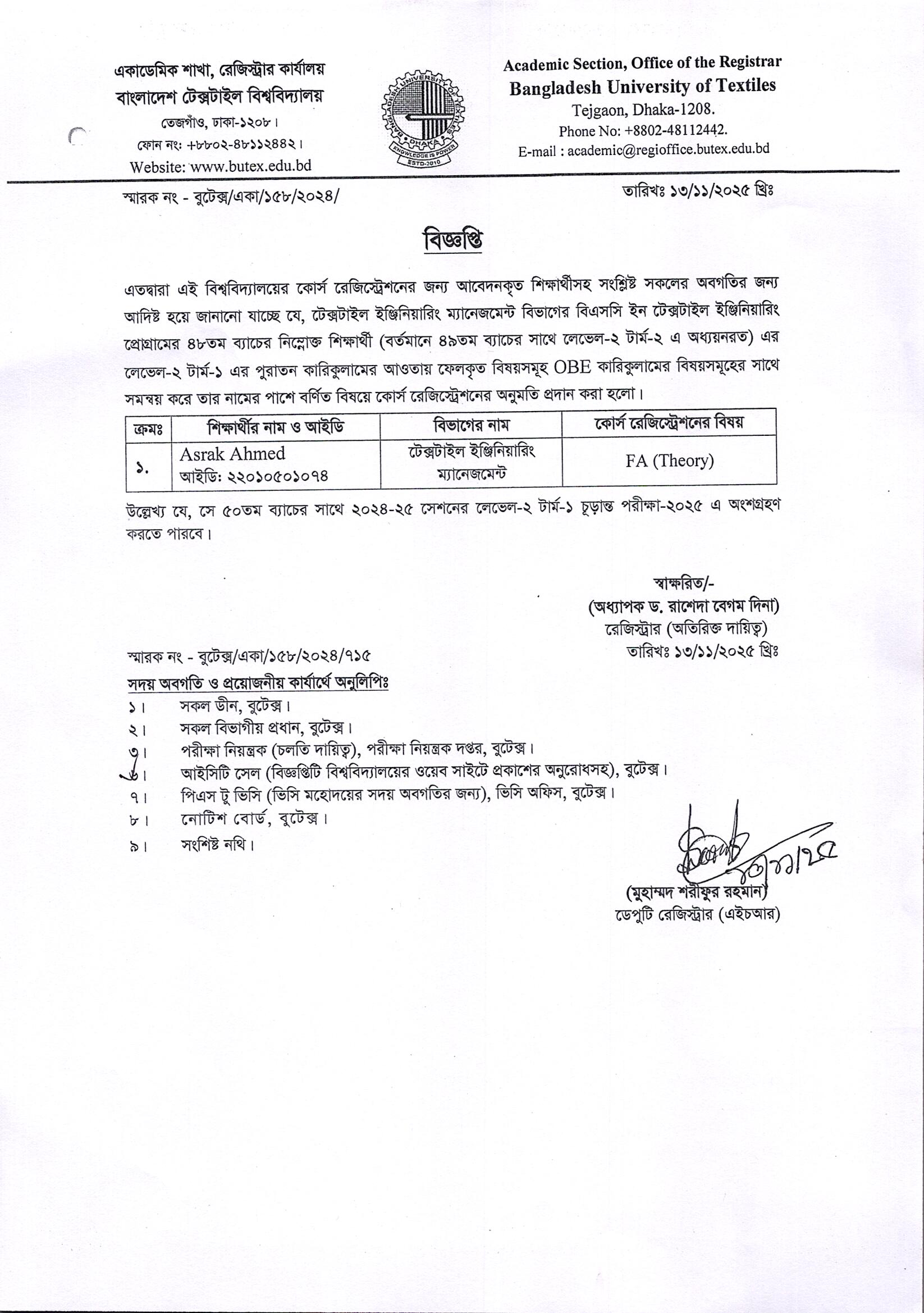 Course Registration: BSc in Textile Engineering, 48 Batch ID: 22010501074