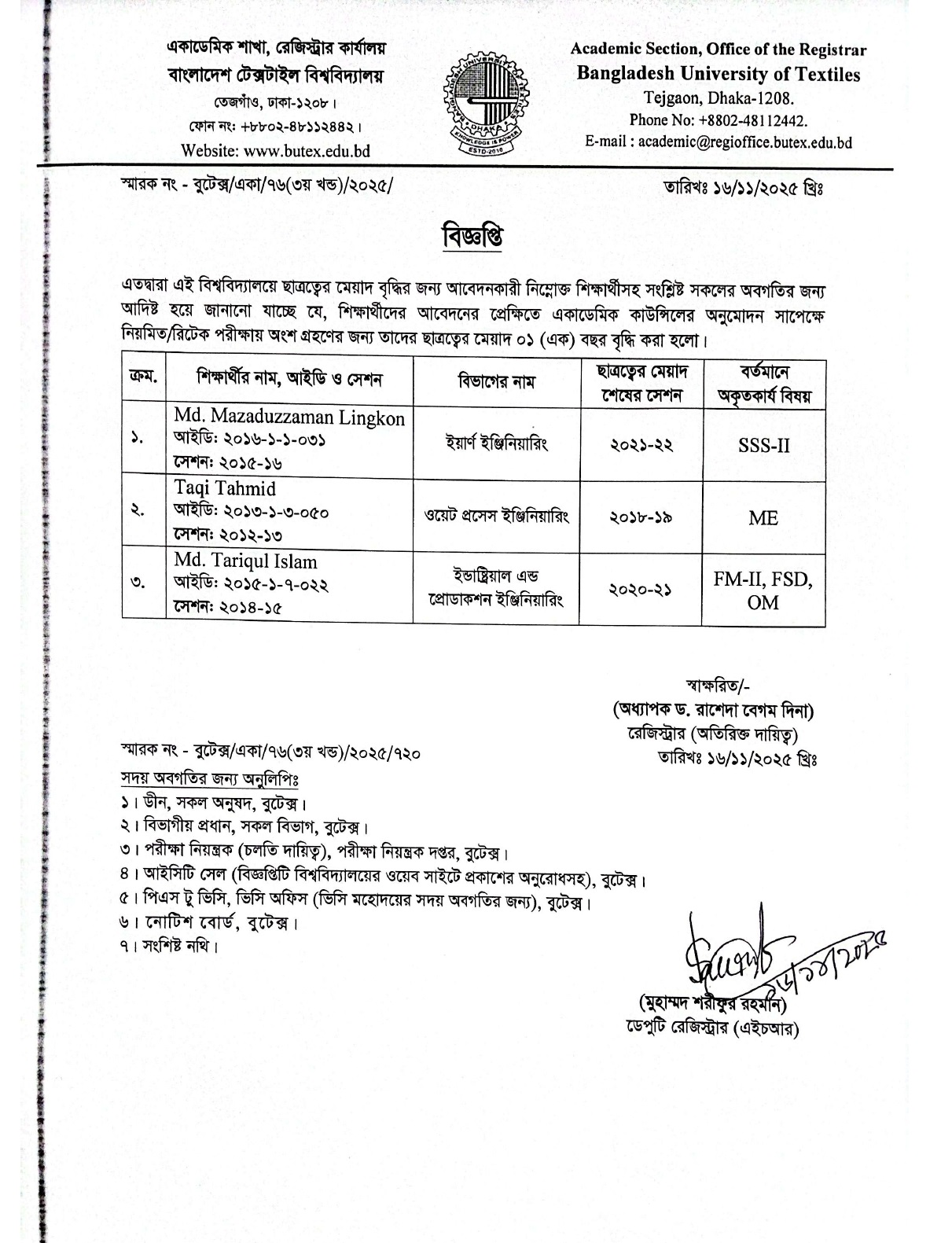 Studentship Period Extension Notice of BSc in Textile Engineering Program