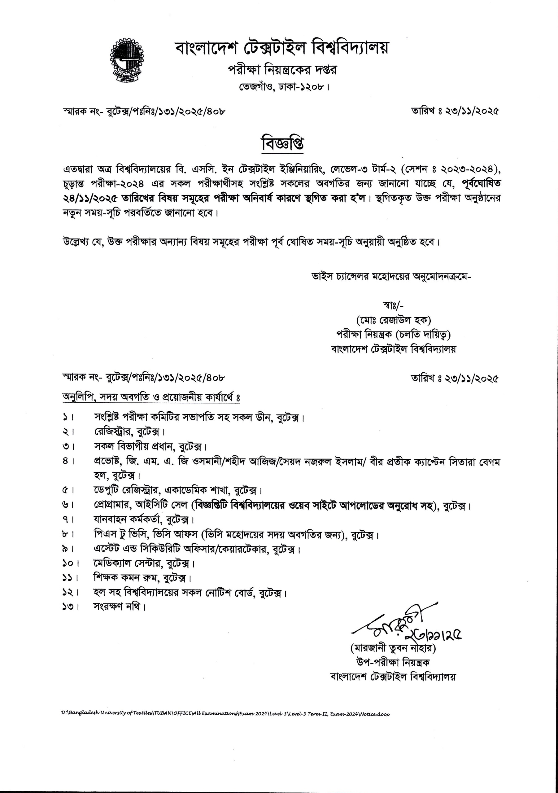 Exam Postponed Dated 24-11-2025: BSc in Textile Engineering L-3 T-2