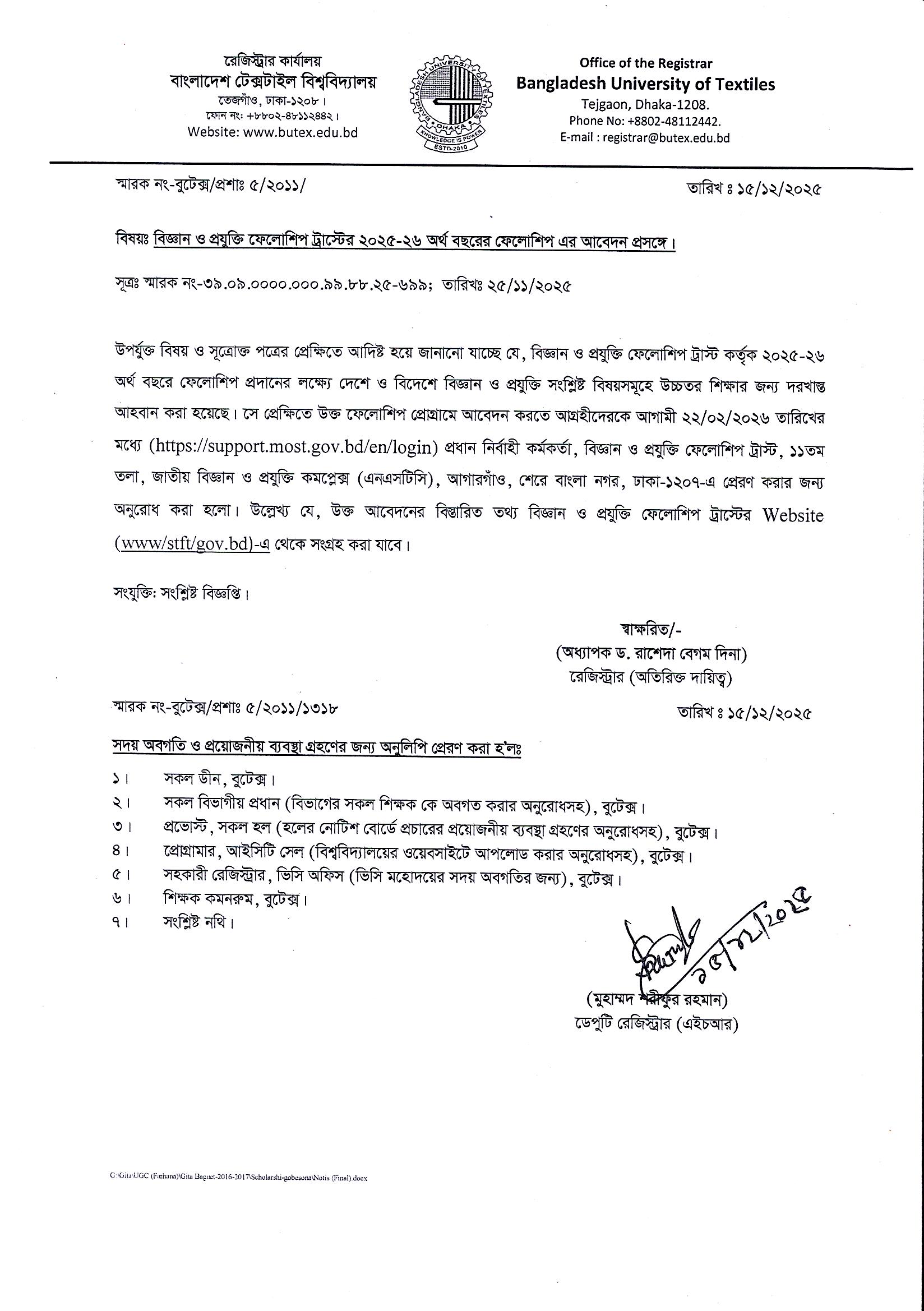 Science & Technology Fellowship Trust Scholarship (Year: 2025-26)