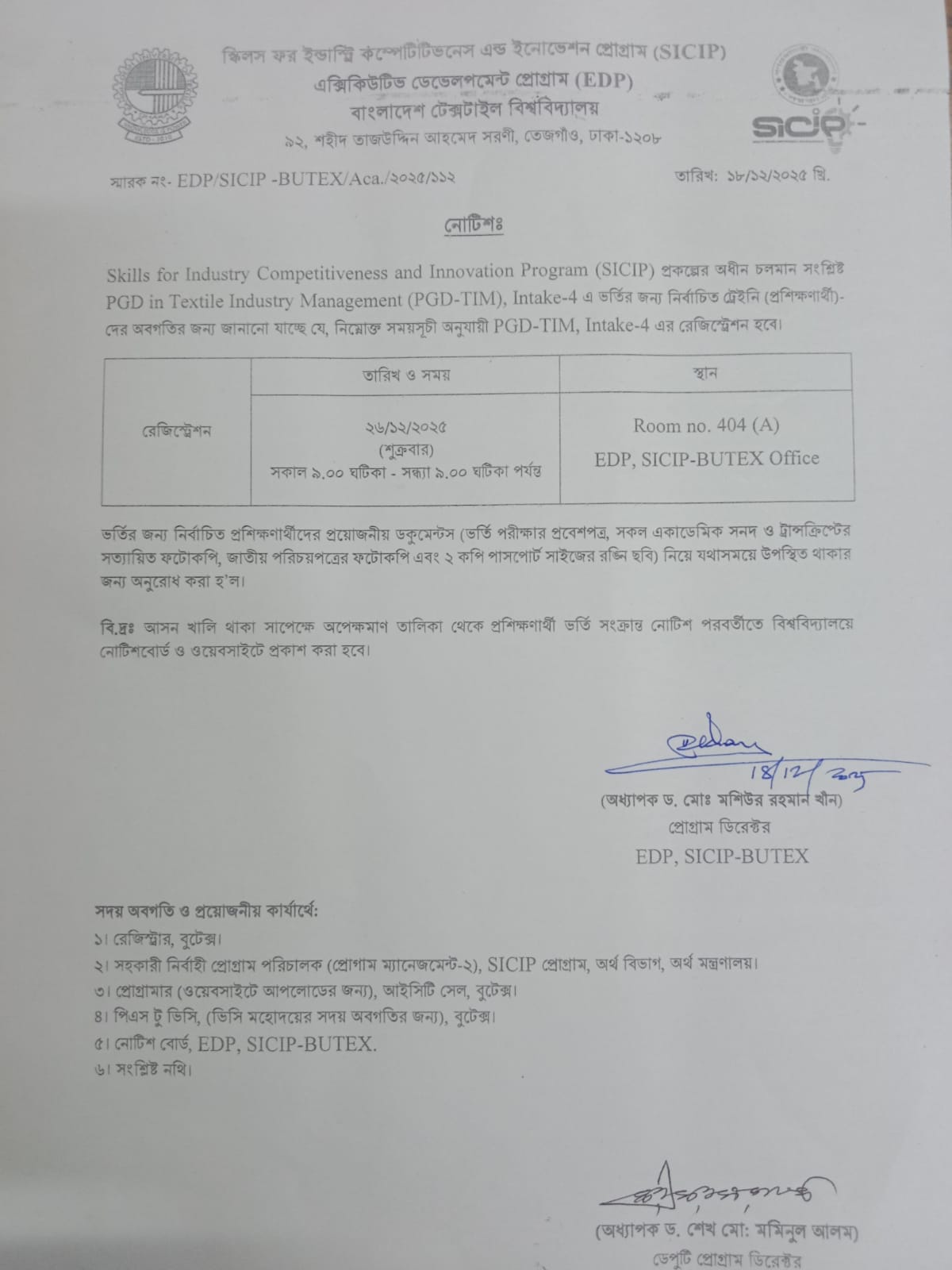 3rd Call Notice for Selected & Waiting Candidates of BSc in Textile Engineering Admission Test 2025-26