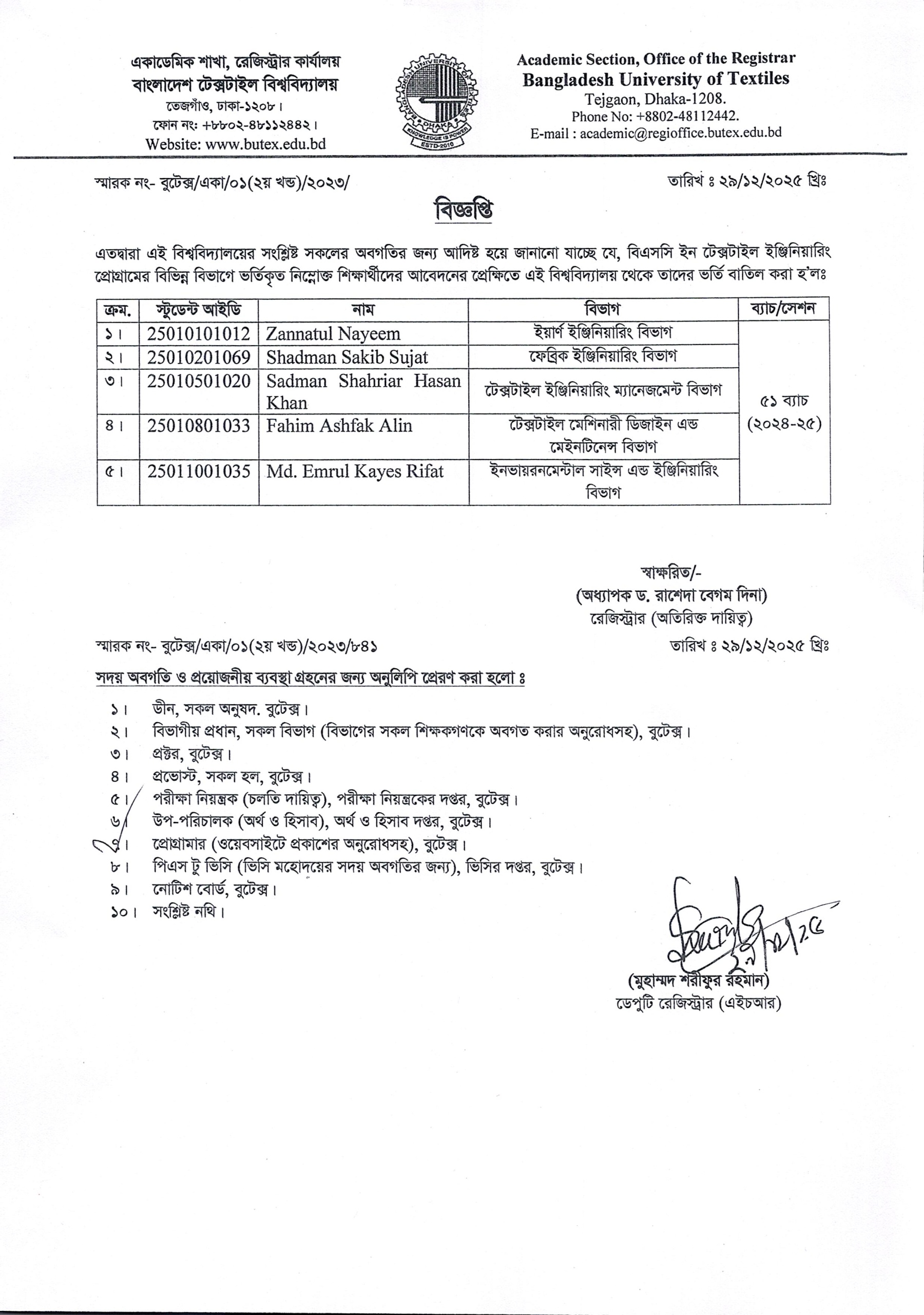 Admission Cancellation Notice of BSc in Textile Engineering Dated: 29/12/2025