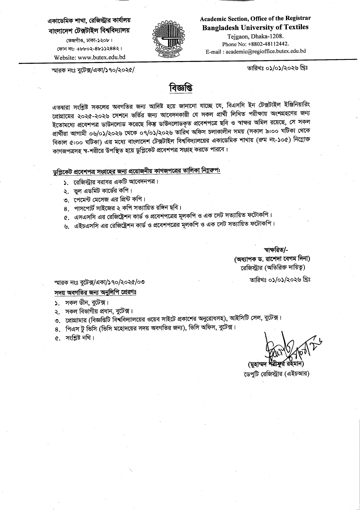 3rd Call Notice for Selected & Waiting Candidates of BSc in Textile Engineering Admission Test 2025-26