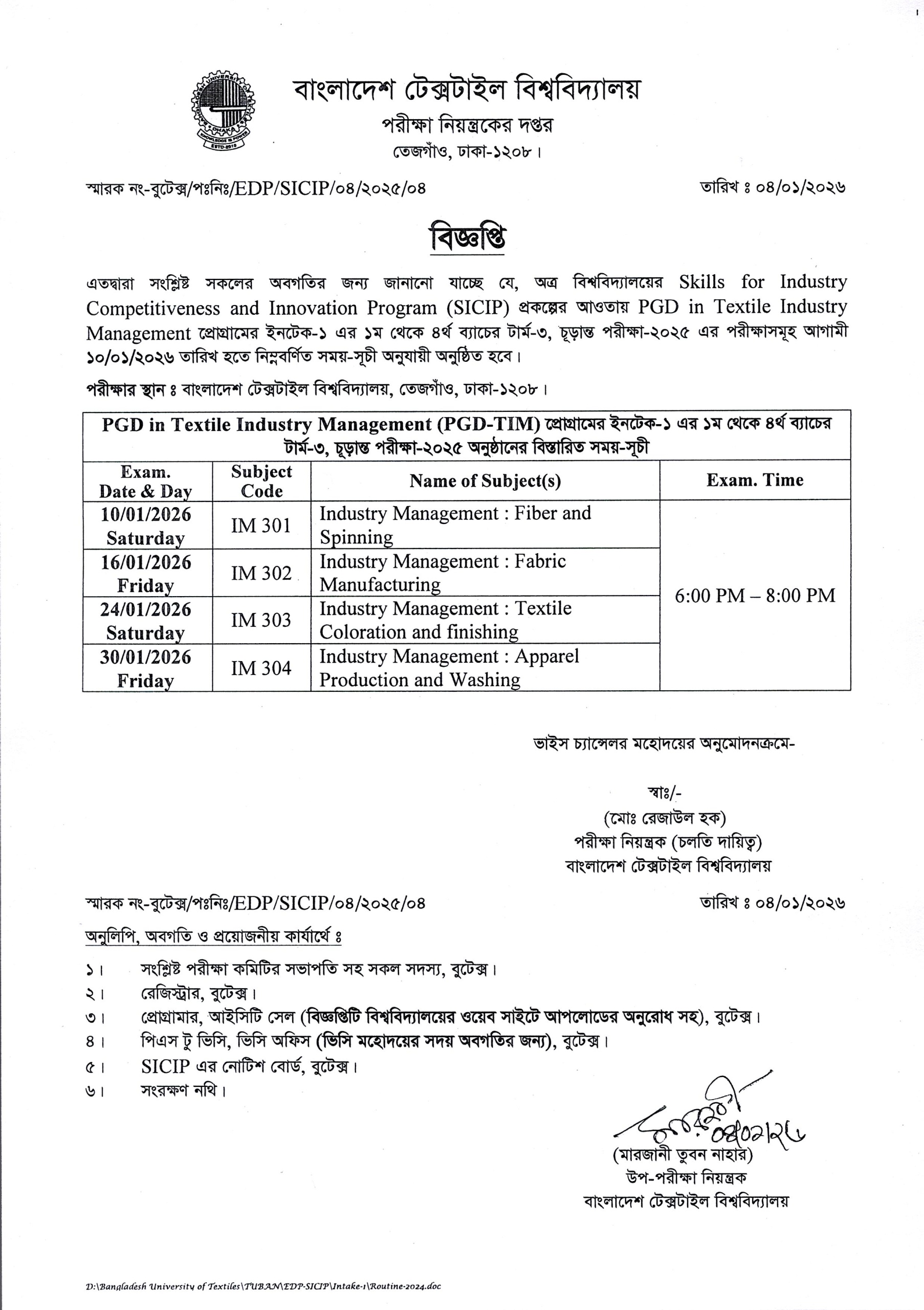 Examination Schedule-2025 of Intake-1 Term-3 PGD in Textile Industry Management