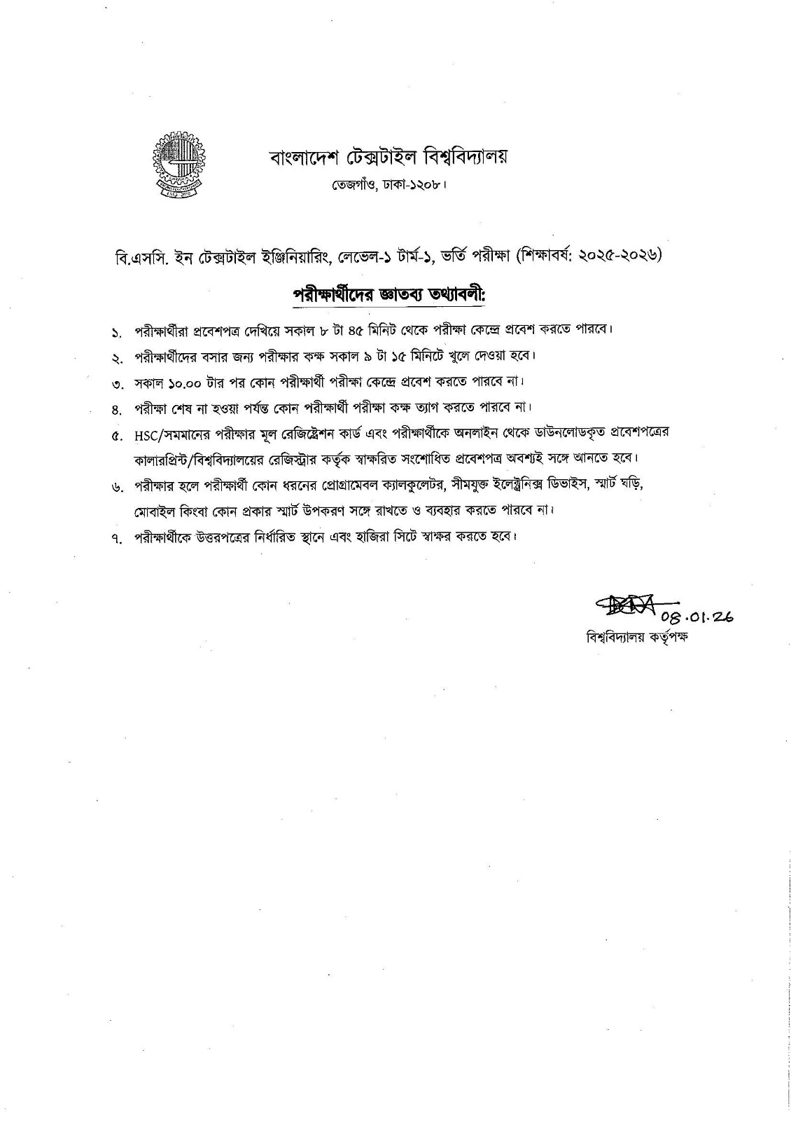 Guidelines for Candidates of BSc in Textile Engineering Admission Test 2025-26
