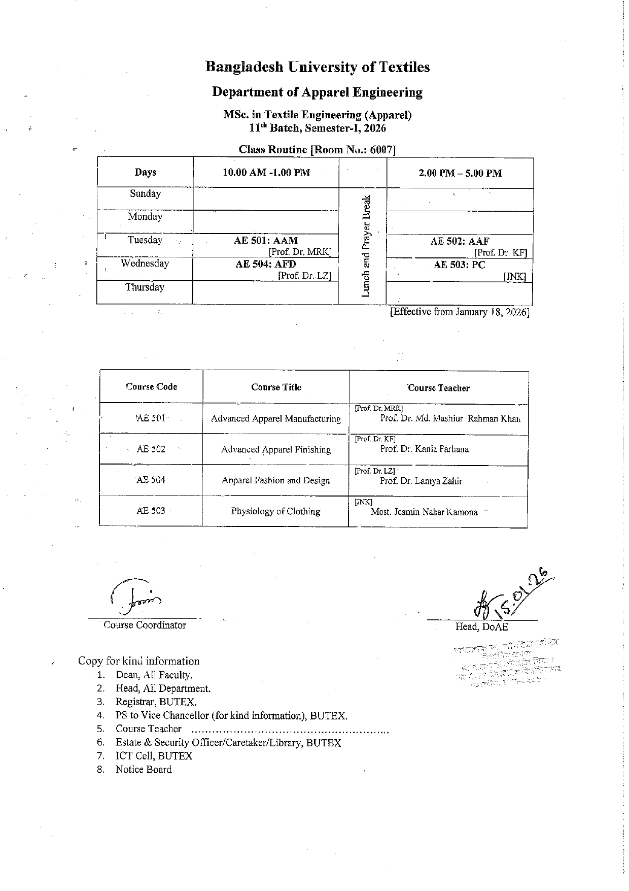 Class Schedule of MSc in Textile Engineering (Apparel) 11th Batch Semester-I