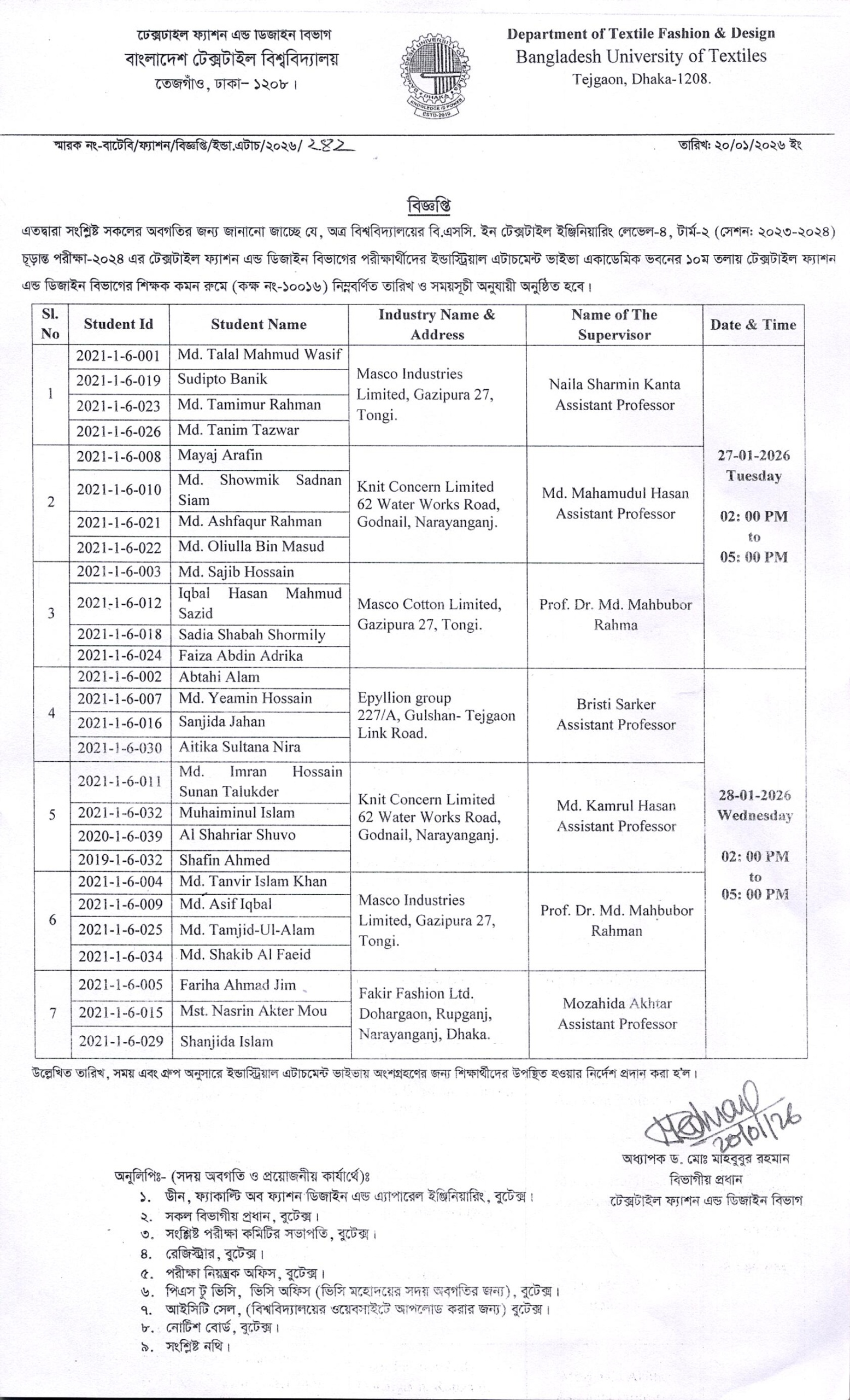 Fashion & Design Dept. Project Work, Industrial Attachment & Comprehensive Viva of BSc in Textile Engineering L-4 T-2