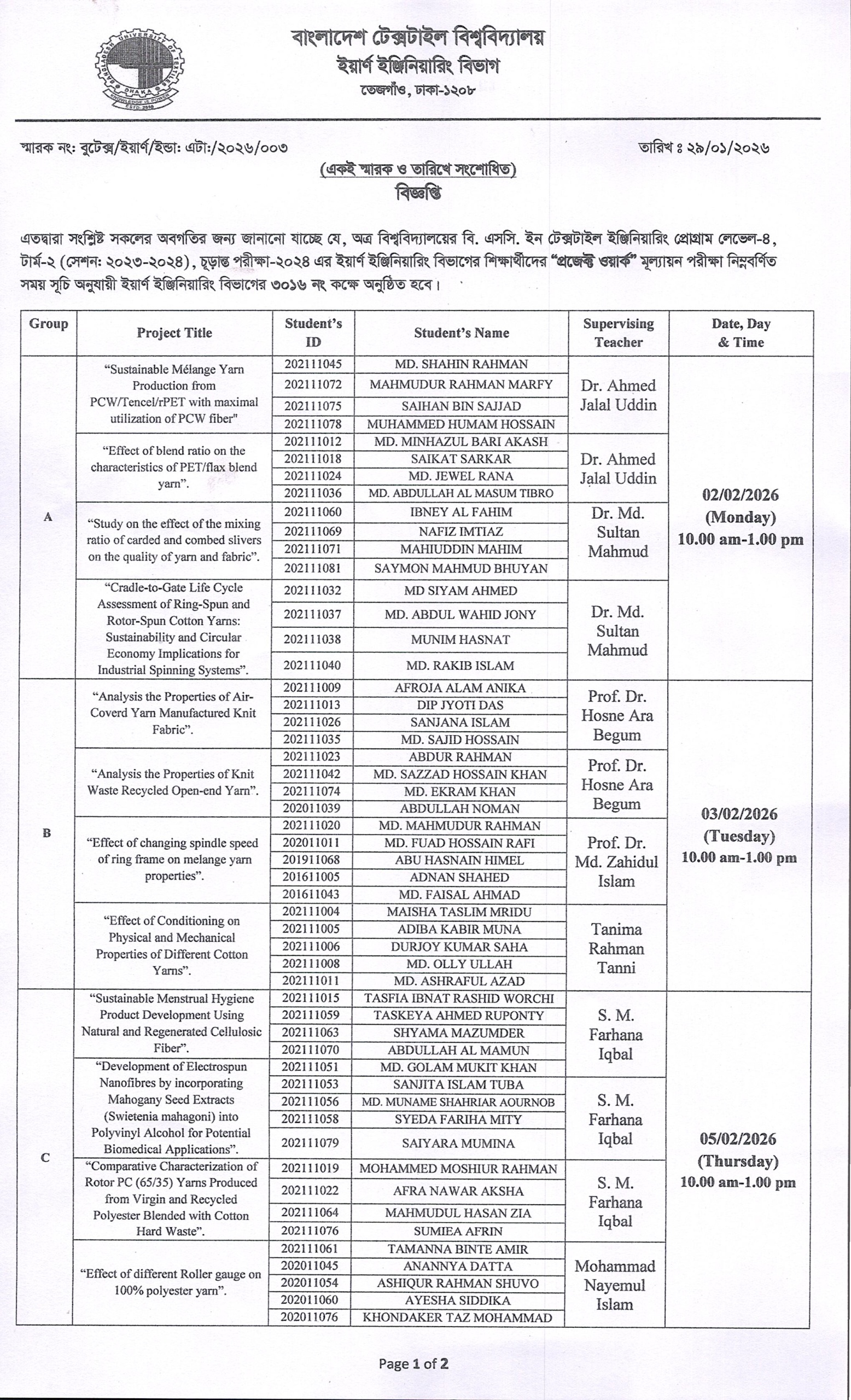 Yarn Dept. Project Work, Industrial Attachment & Comprehensive Viva of BSc in Textile Engineering L-4 T-2