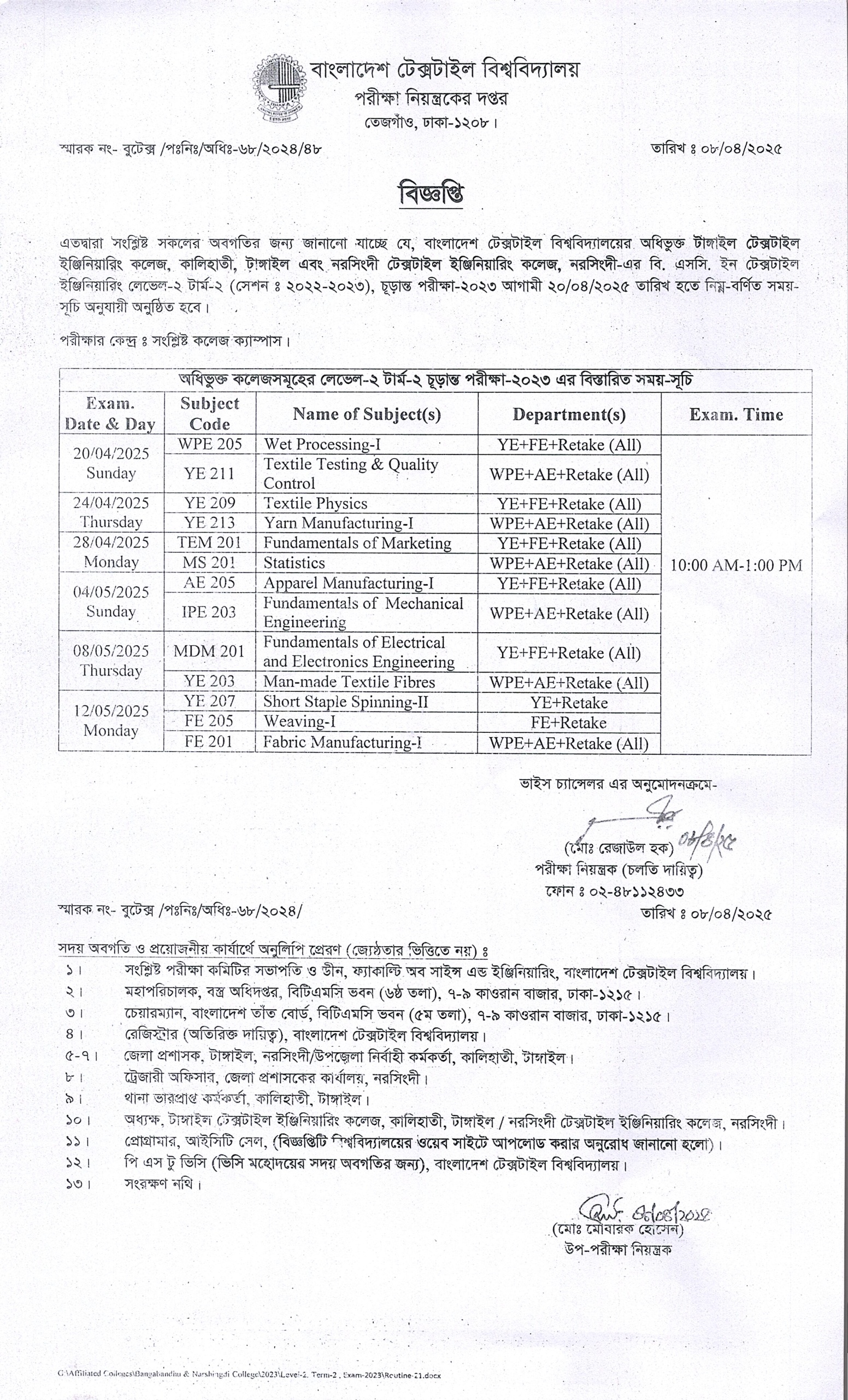 TTEC, NTEC Exam Schedule: BSc in Textile Engineering L-2 T-2 Exam-2023