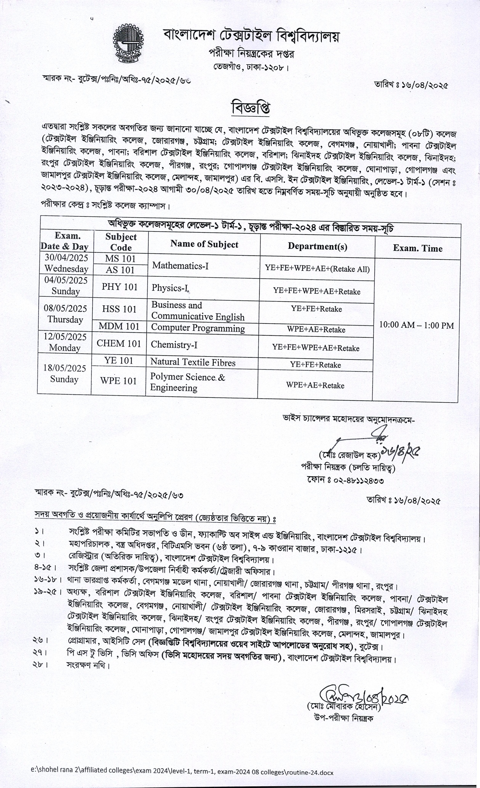 AC Exam Schedule: BSc in Textile Engineering L-1 T-1 Exam-2024
