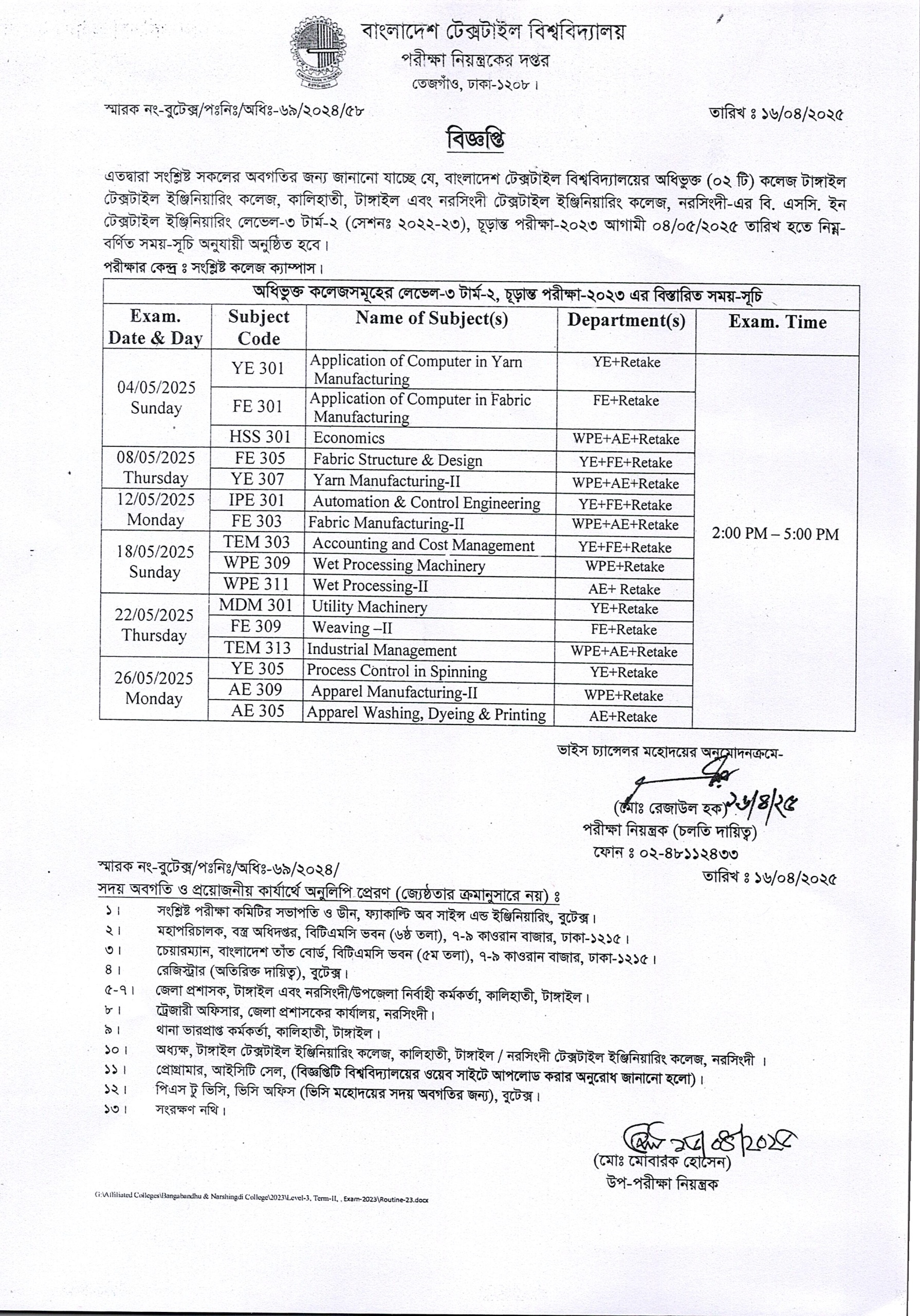 TTEC, NTEC Exam Schedule: BSc in Textile Engineering L-3 T-2 Exam-2023