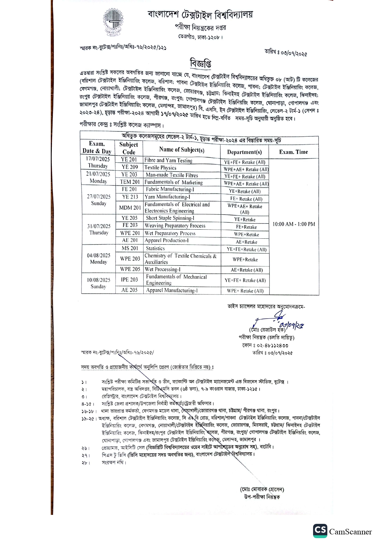 AC Exam Schedule: BSc in Textile Engineering L-2 T-1, Exam-2024
