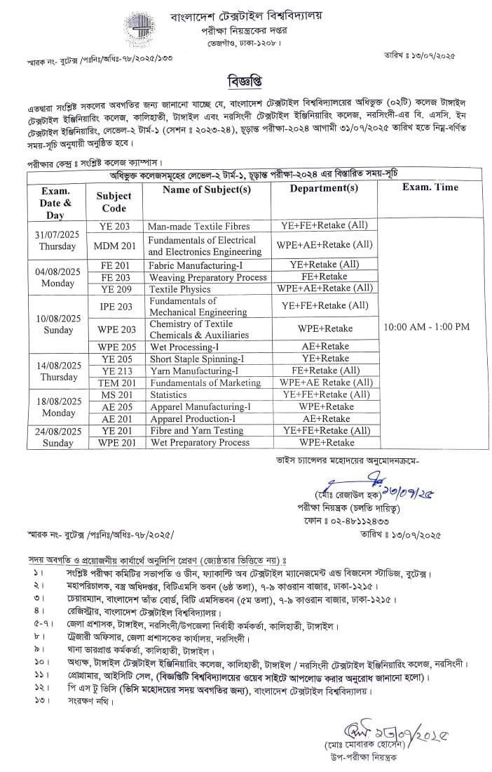 AC Exam Schedule: BSc in Textile Engineering L-2 T-1, Exam-2024