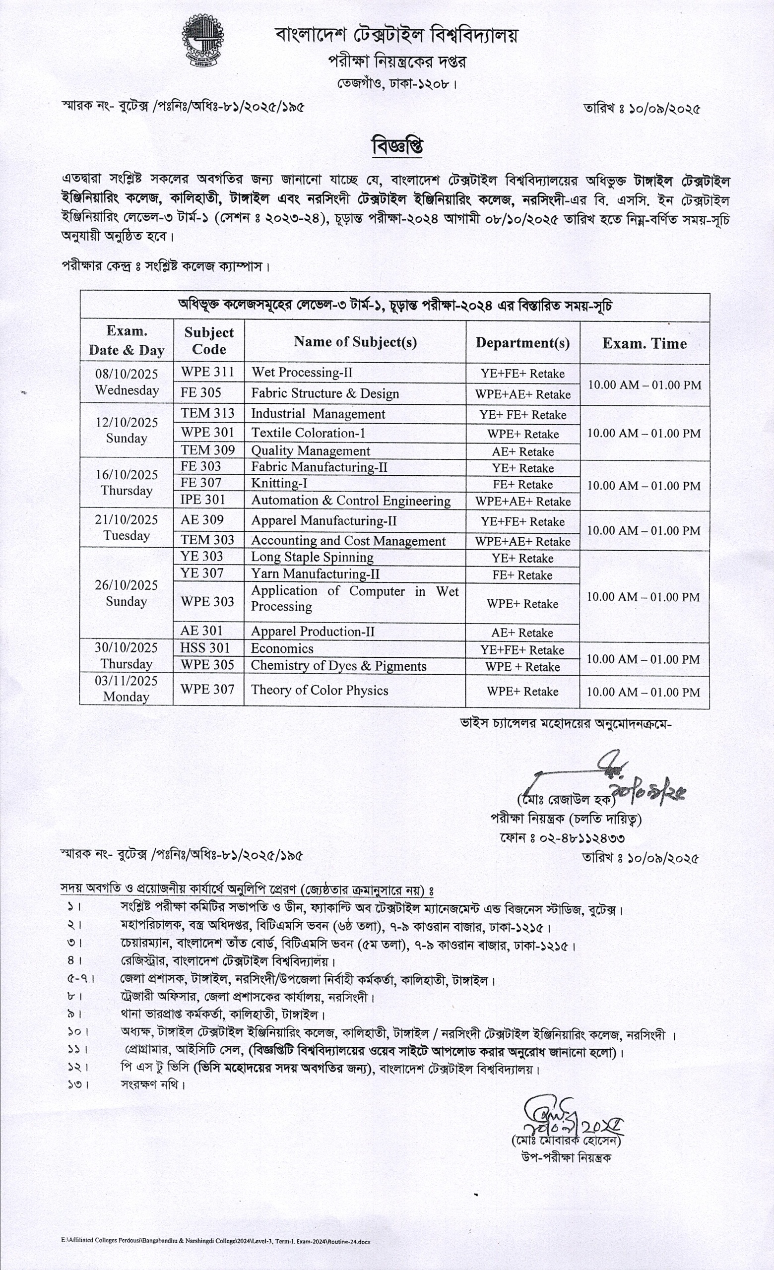 TTEC, NTEC: BSc in Textile Engineering L3-T1 Exam-2024 Schedule