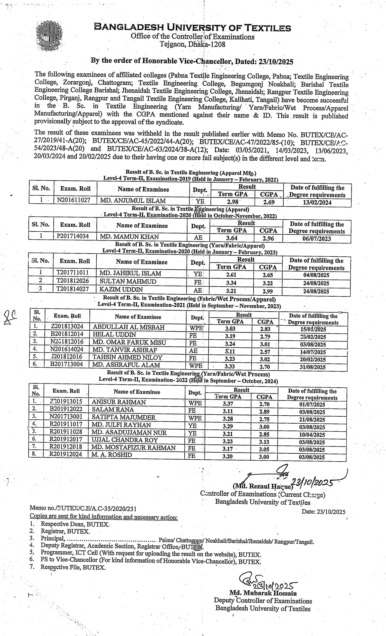 Affiliated Colleges: Withheld Result of BSc in Textile Engineering L4-T2