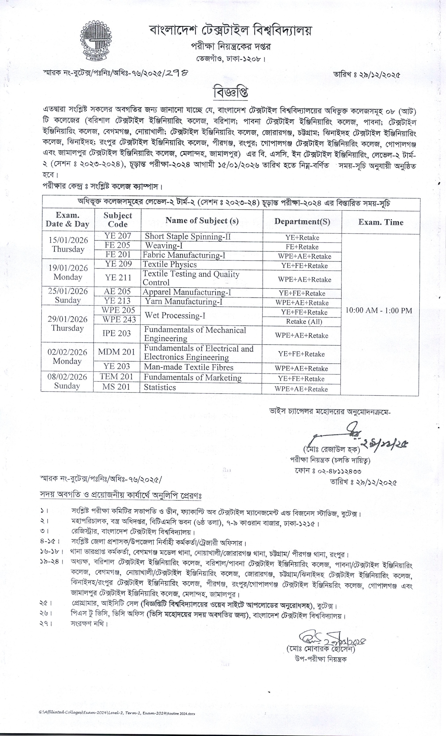 3rd Call Notice for Selected & Waiting Candidates of BSc in Textile Engineering Admission Test 2025-26
