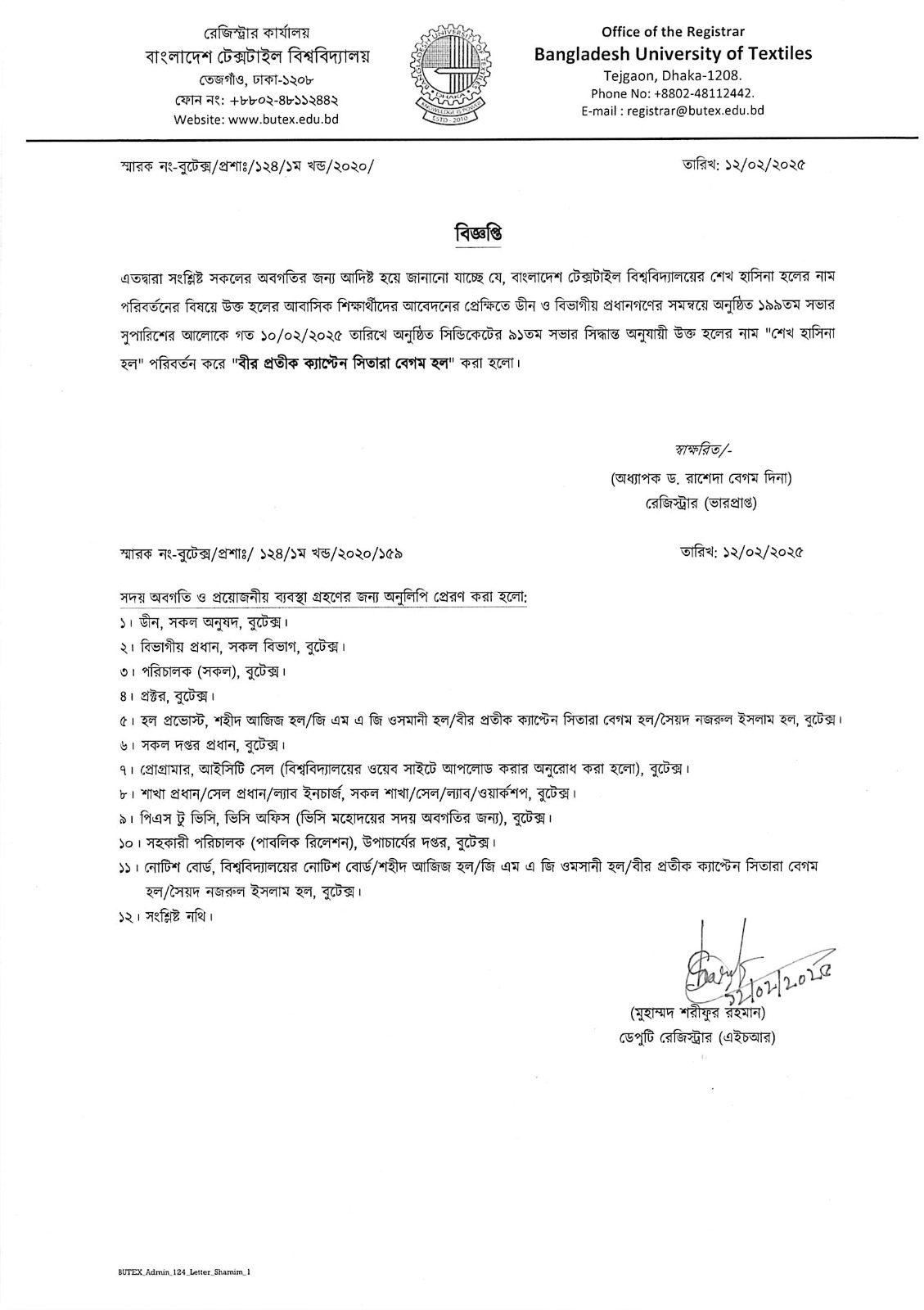 সিন্ডিকেটের ৯১ তম সভার সিদ্ধান্ত অনুযায়ী বিশ্ববিদ্যালয়ের শেখ হাসিনা হলের নাম পরিবর্তন করে “বীর প্রতীক ক্যাপ্টেন সিতারা বেগম হল” করা হলো