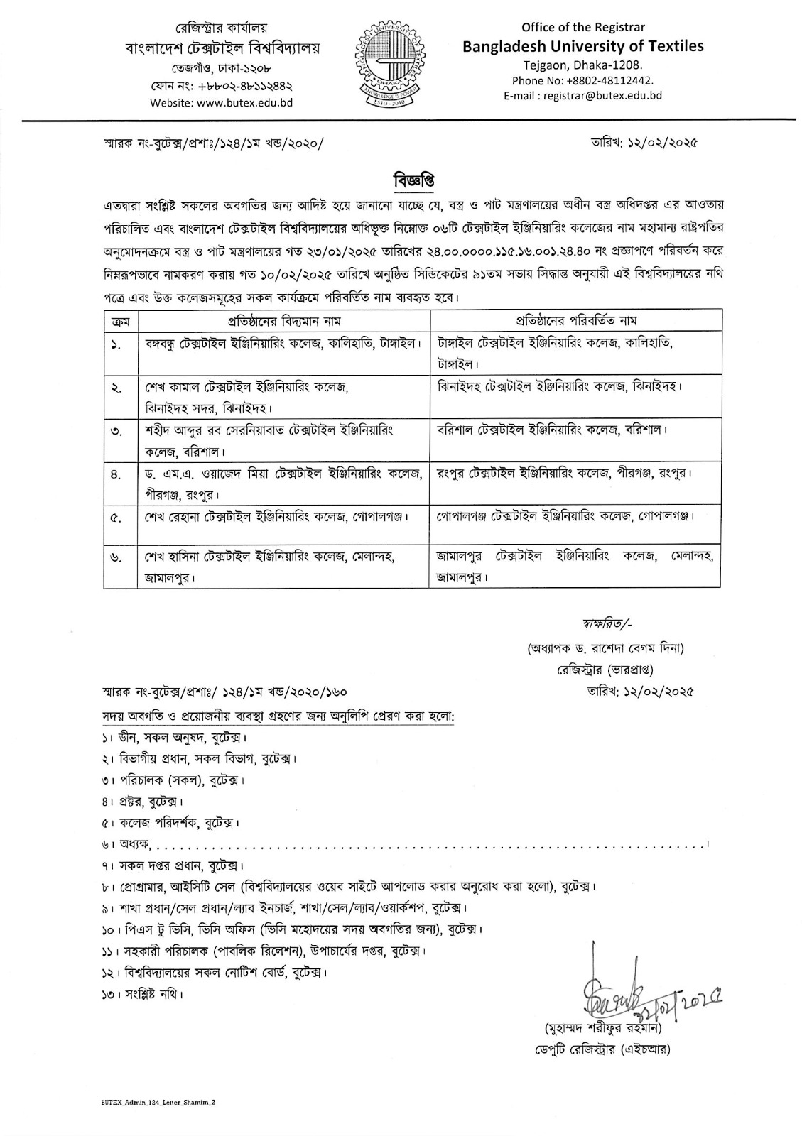 বাংলাদেশ টেক্সটাইল বিশ্ববিদ্যালয়ের অধিভূক্ত নিম্নোক্ত ০৬টি টেক্সটাইল ইঞ্জিনিয়ারিং কলেজের পরিবর্তিত নাম সংক্রান্ত বিজ্ঞপ্তি