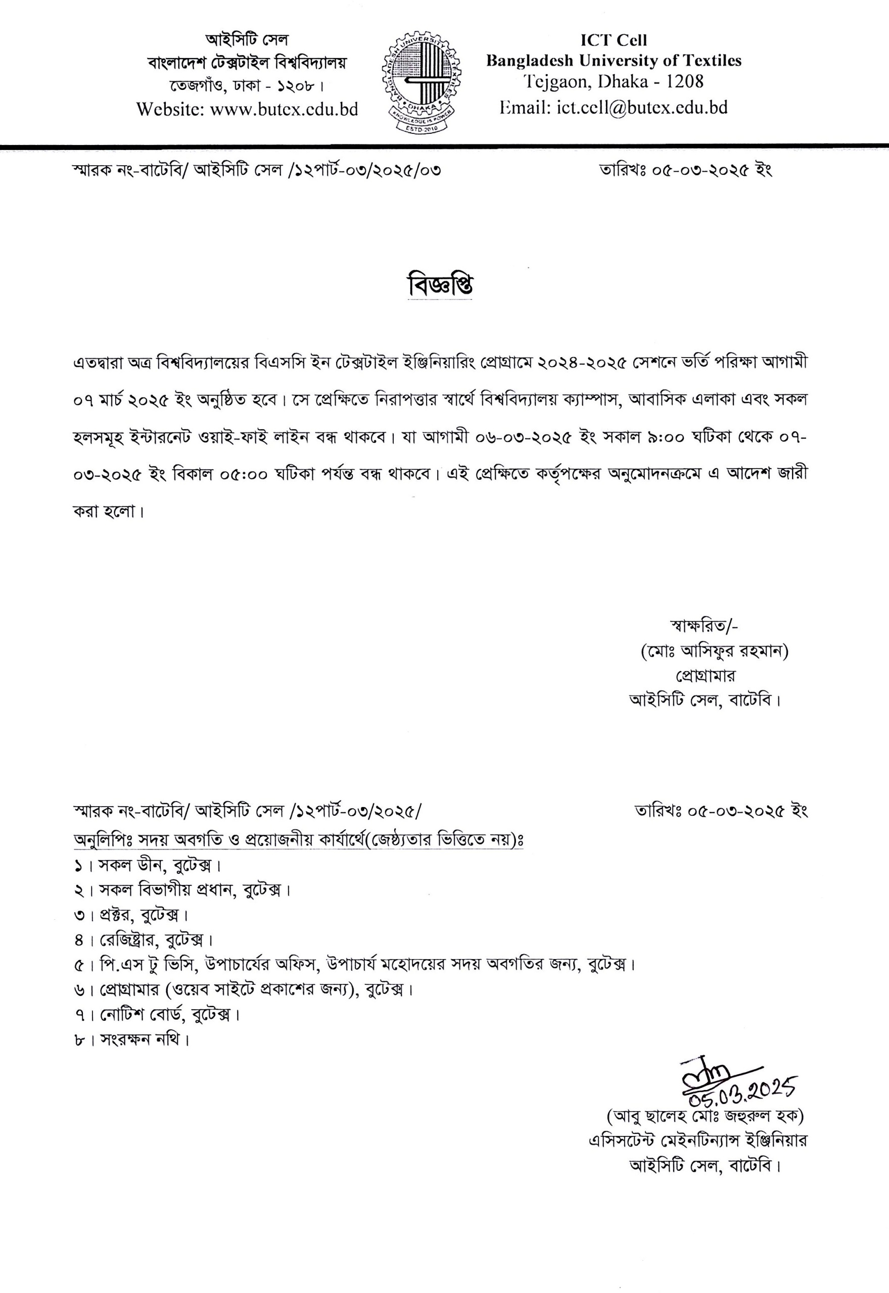 ভর্তি পরীক্ষার কাজে নিরাপত্তার স্বার্থে আগামী ০৬/০৩/২০২৫ তারিখ সকাল ৯:০০ ঘটিকা হতে ০৭/০৩/২০২৫ তারিখ বিকাল ৫:০০ ঘটিকা পর্যন্ত ইন্টারনেট সেবা বন্ধ থাকবে
