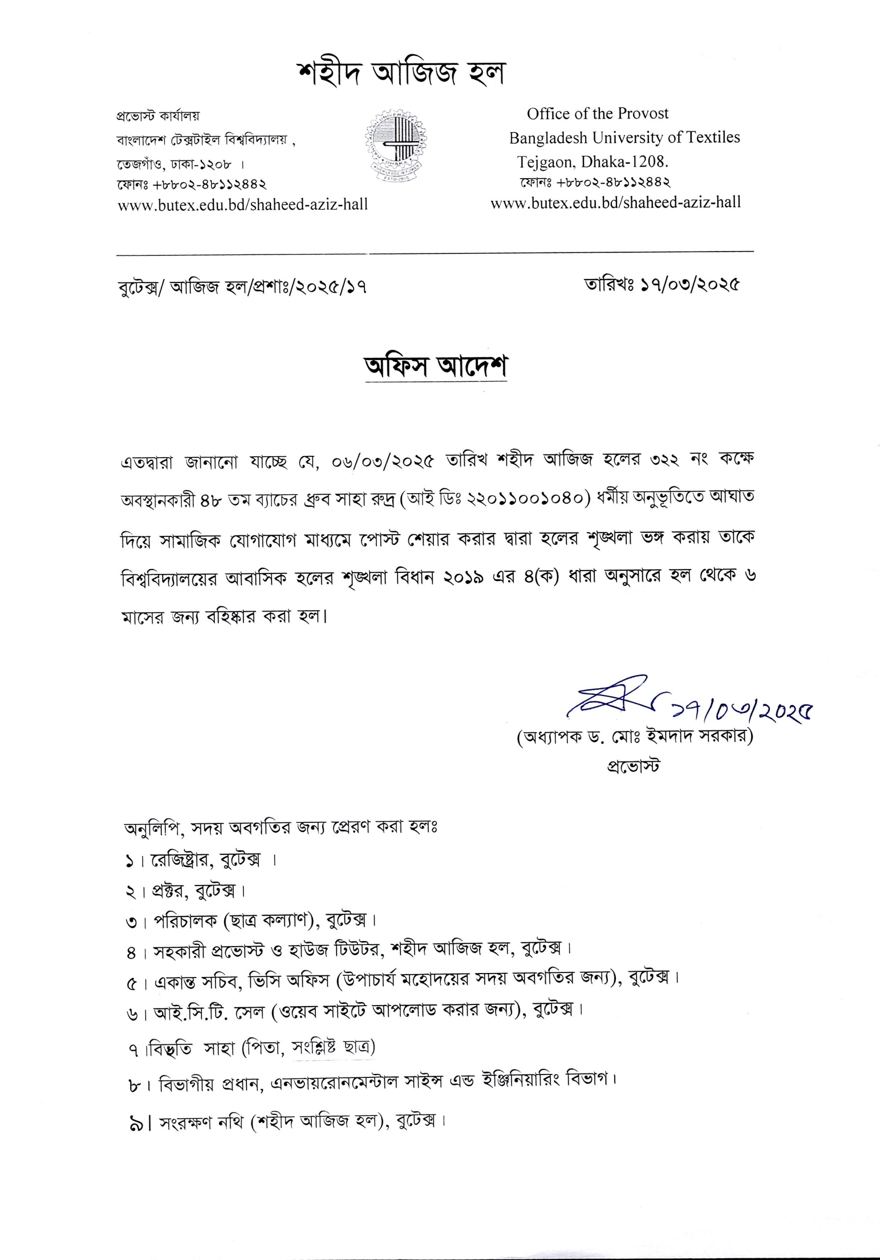 Disciplinary Notice of Shaheed Aziz Hall