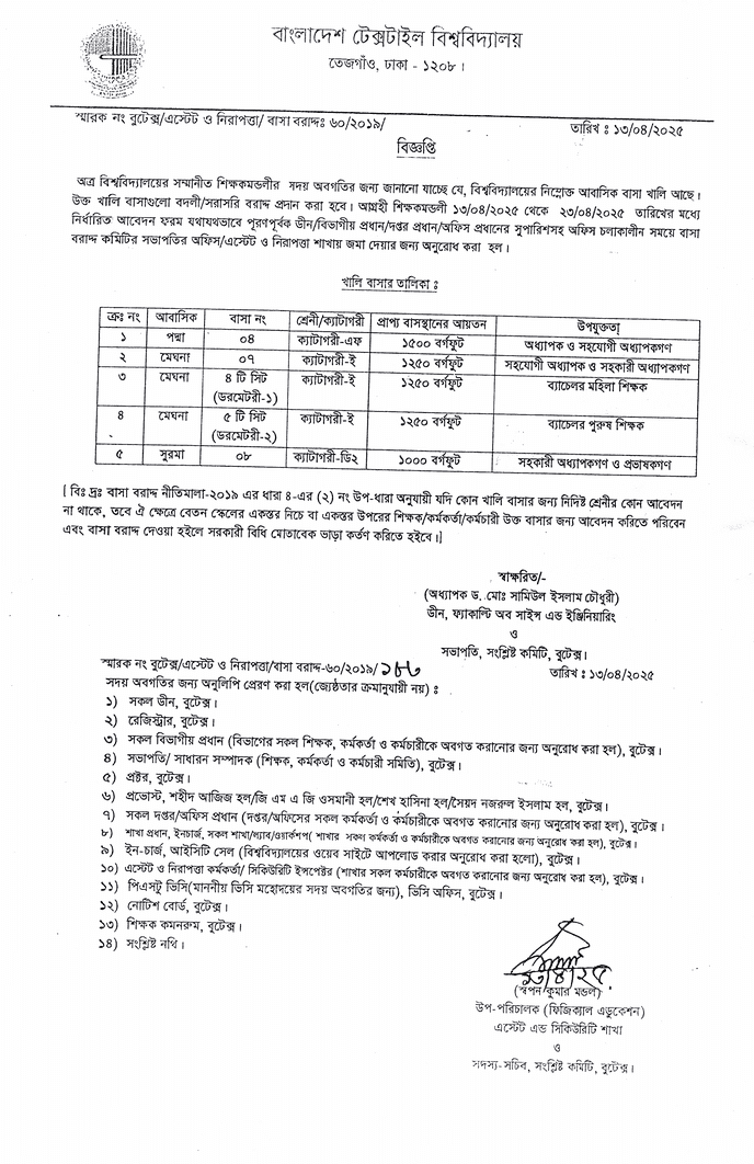 3rd Call Notice for Selected & Waiting Candidates of BSc in Textile Engineering Admission Test 2025-26