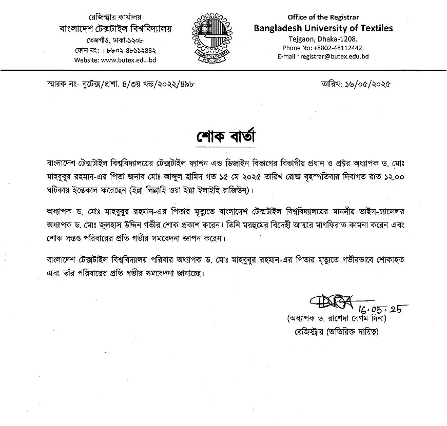 শোক বার্তা: বাংলাদেশ টেক্সটাইল বিশ্ববিদ্যালয় পরিবার অধ্যাপক ড. মোঃ মাহবুবুর রহমান-এর পিতার মৃত্যুতে গভীরভাবে শোকাহত এবং তাঁর পরিবারের প্রতি গভীর সমবেদনা জানাচ্ছে।