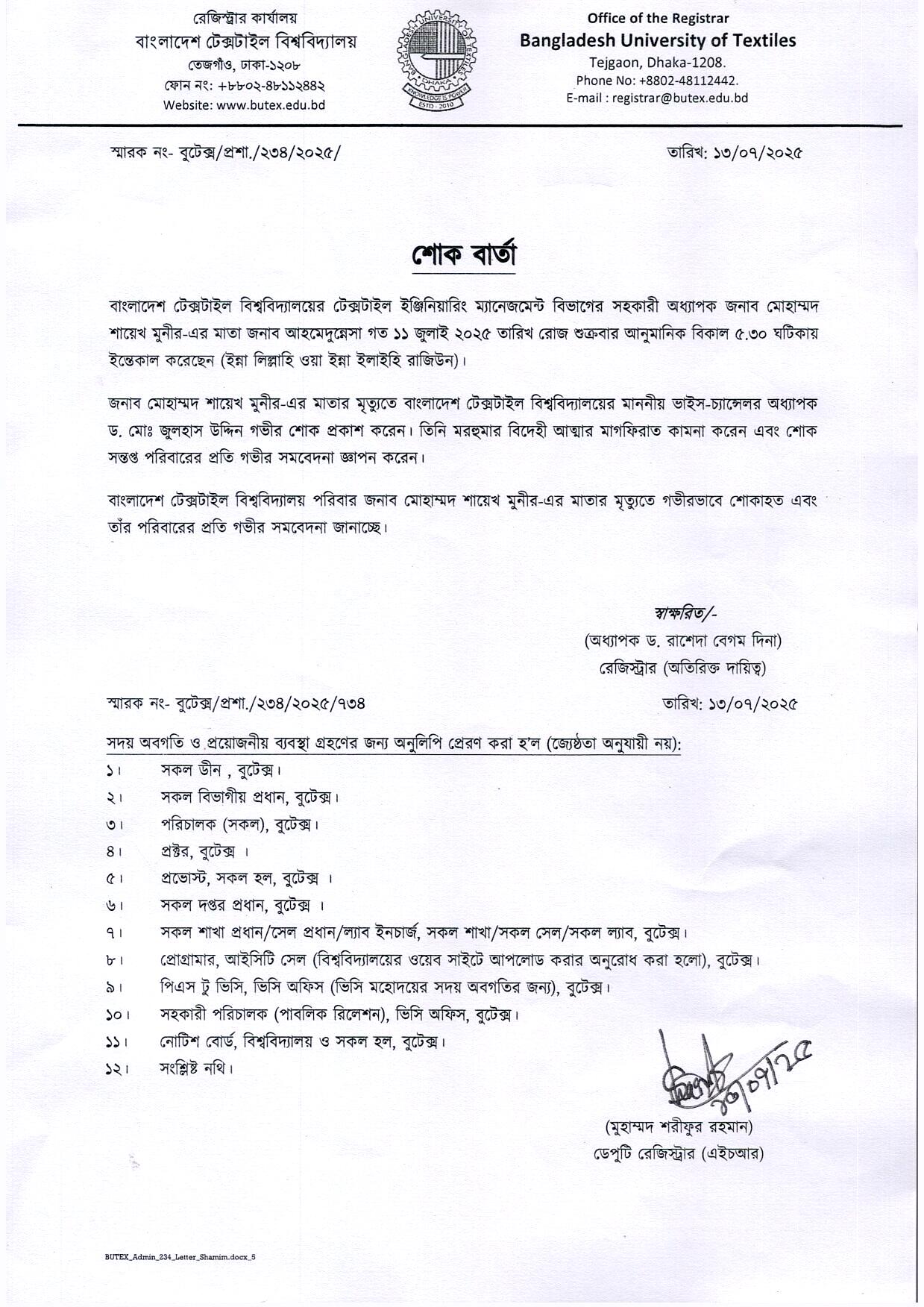 3rd Call Notice for Selected & Waiting Candidates of BSc in Textile Engineering Admission Test 2025-26