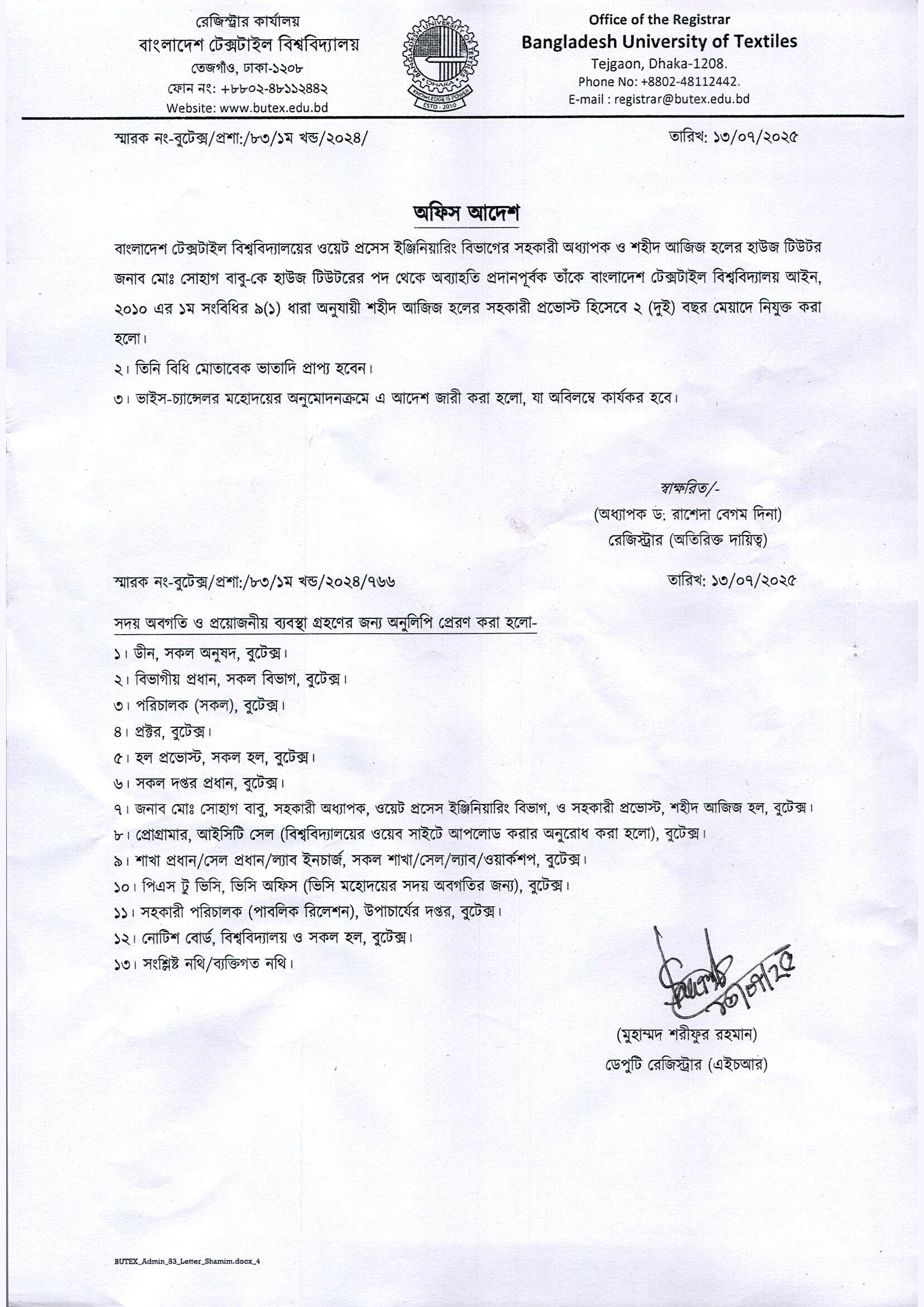 3rd Call Notice for Selected & Waiting Candidates of BSc in Textile Engineering Admission Test 2025-26