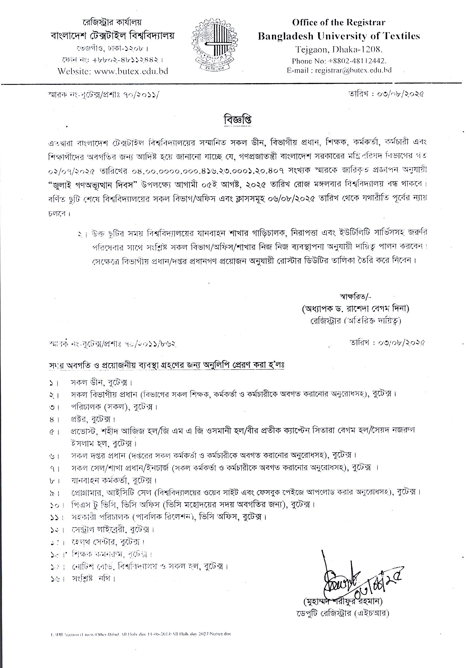 “জুলাই গণঅভ্যুত্থান দিবস” উপলক্ষে ০৫/০৮/২০২৫ তারিখ ছুটি প্রসঙ্গে বিজ্ঞপ্তি